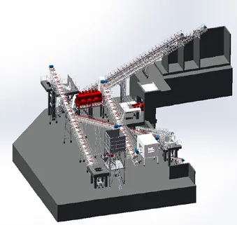 经验证,生产线运行稳定,生产效率达到设计要求,骨料粒型好,洁净度高,一体化除尘系统的应用实现了生产线粉尘排放浓度应不大于10mg/m³。 图 4 为建筑固废资源化利用生产线三维模型图。