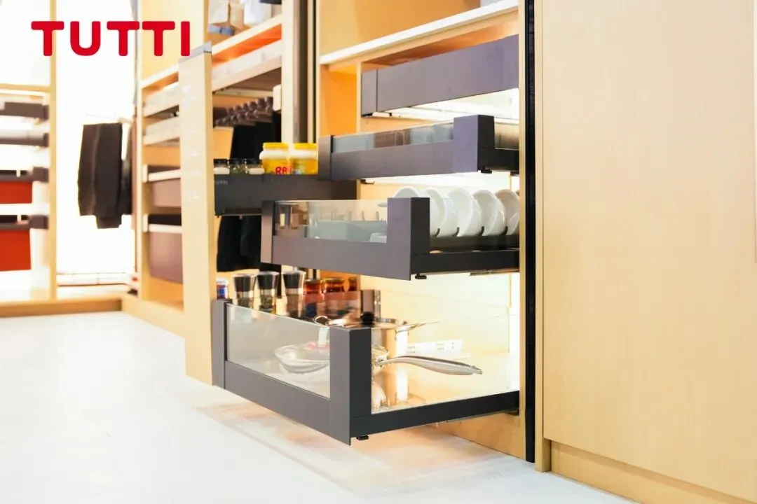 革新传统木抽,以纤薄金属侧帮重塑抽屉美学;超薄无叠边设计,最大化拓展内部使用空间。隐藏式三节同步滑轨实现全拉出结构,物品一览无余、取用自如;镀锌板滑轨坚固耐用,开合轻柔顺滑。多样款式灵活选择,为全球家居空间注入简约质感与精致细节。