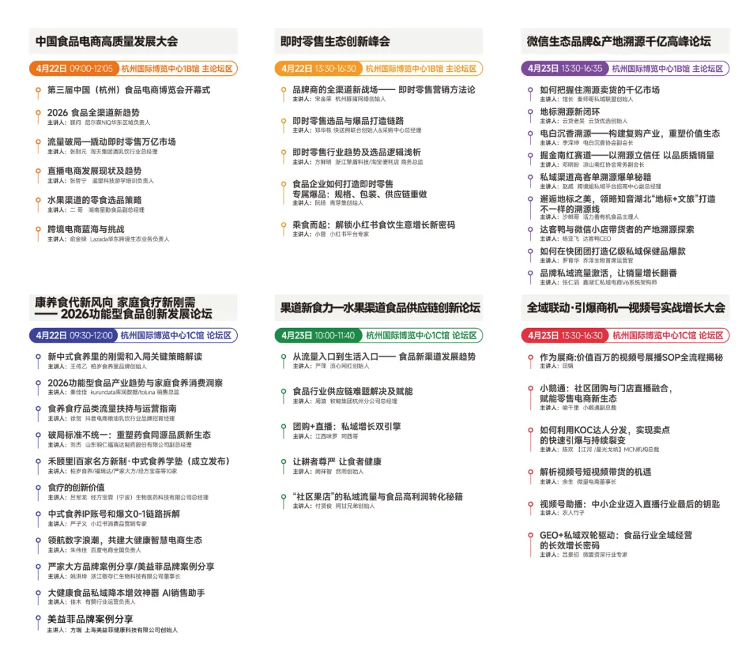 展会同期在1B馆和1C馆将举办多场行业趋势论坛,是行业领军人的思想交锋场,包括:中国食品电商高质量发展大会、即时零售生态创新峰会、2026功能型食品创新发展论坛、水果渠道食品供应链创新论坛、微信生态品牌&产地溯源千亿高峰论坛、视频号实战增长大会。
