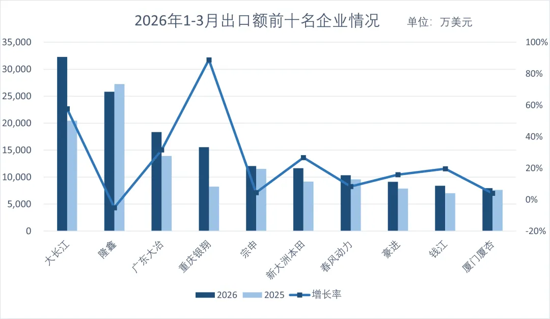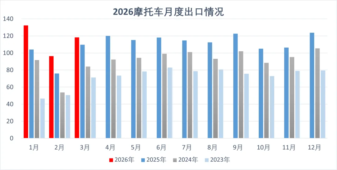 据中国摩托车商会数据,2026 年一季度我国摩托车出口延续强劲增长,规模以上企业整车出口 347.37 万辆,同比增长 18.66%;出口金额 23.25 亿美元,同比增长 21.52%,实现量价齐升。面对中东局势引发的物流受阻、油价与供应链成本上涨等外部压力,行业依靠多元化市场布局、完备产业链优势及产品结构优化,有效对冲风险,整体出口态势稳健。
