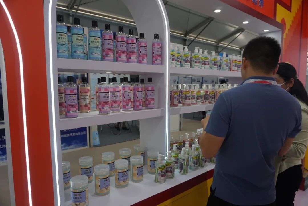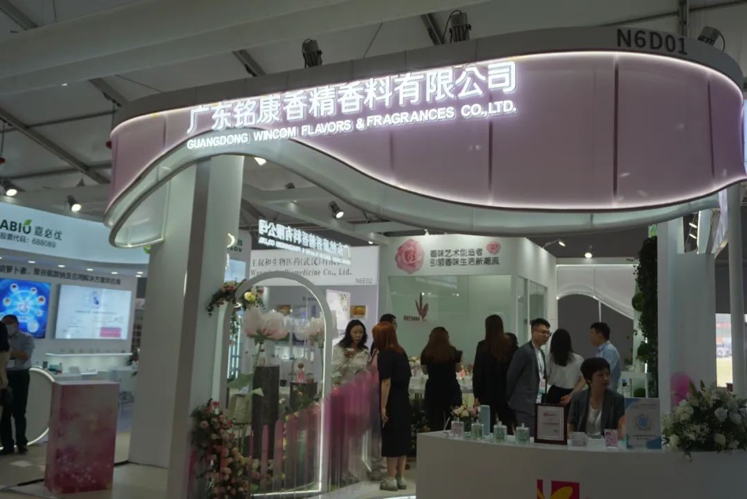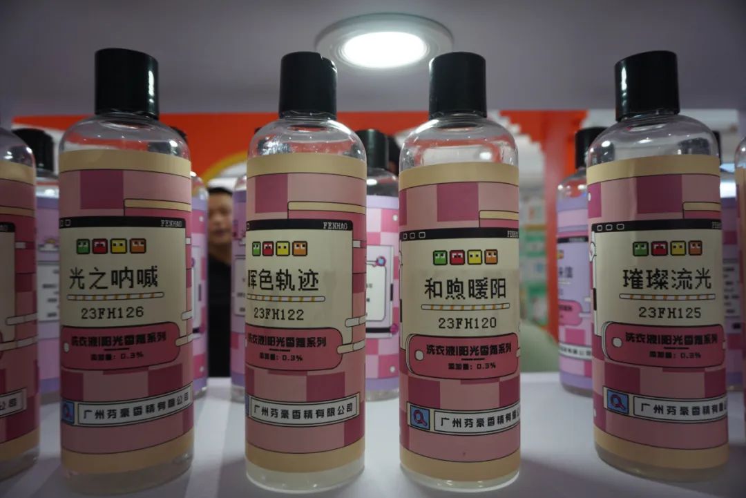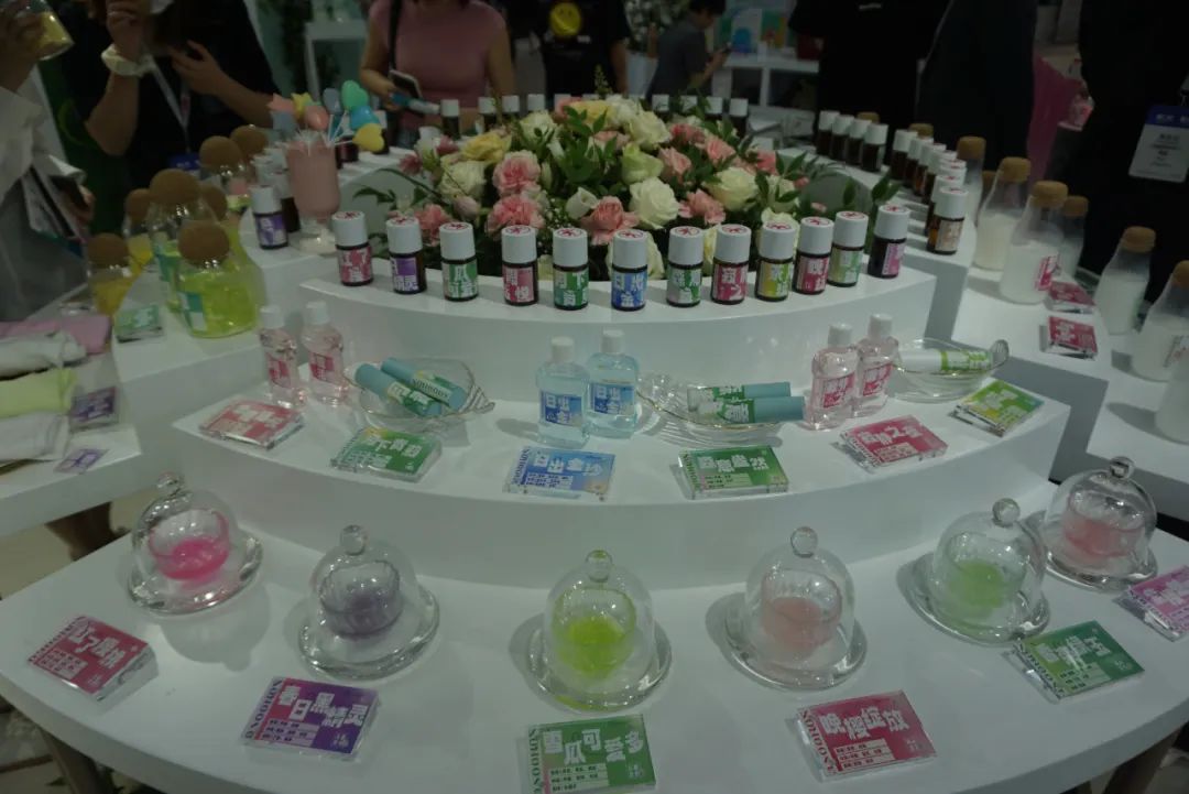 广东铭康香精香料有限公司的展品琳琅满目、五彩缤纷,从儿童牙膏、芳香型洗护产品、家用香薰到香水,应有尽有。