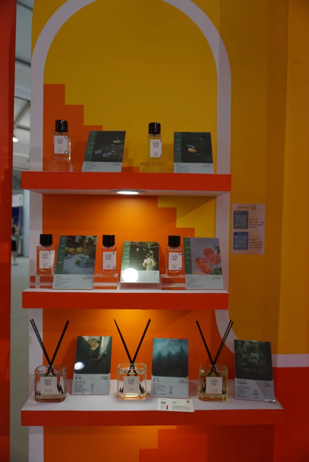 芬豪合作香水品牌“寻香之旅”的产品展示墙 铭康和芬豪的工作人员都表示,这些展品是公司自主研发的下游产品,仅供展示,展品所用的香精才是公司经营的产品。
