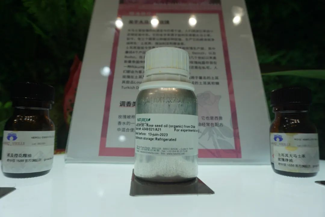 香精香料国际龙头奇华顿的展台离入口不远。此次展出了不少精油、净油等香料产品,包括薰衣草、大马士革玫瑰、天竺葵、没药等,以及成品香水、消费品香精、化妆品活性成分等。