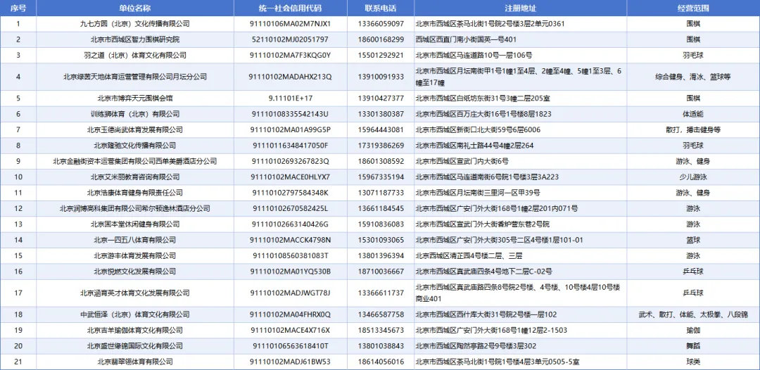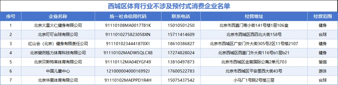 为持续维护西城区体育行业市场健康有序发展,规范预付式消费秩序,保障消费者和经营者合法权益,西城区体育局持续更新西城区体育行业预付式资金监管“白名单”企业,具体名单如下: