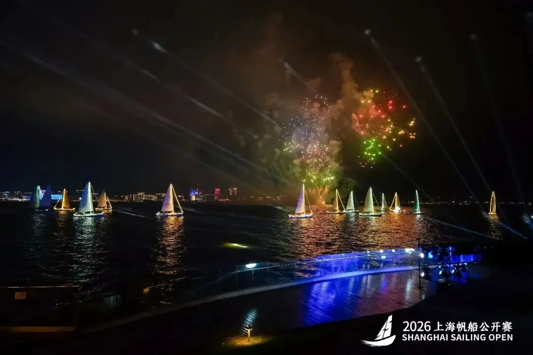 启动仪式后,现场氛围达到高潮。在激昂的乐曲与全场注目下,18艘J80级别帆船在滴水湖上扬帆巡游,象征着“领帆而上”的精神从此刻驶向未来。小荧星合唱团登台献唱,悠扬童声演绎经典曲目。表演与湖上帆影、临港地标“时光之戒”光影烟花秀同步交织,构成声、光、影、帆多维一体的震撼画面。璀璨烟花在夜空绽放,与湖面倒影、帆影、歌声相融,不仅点亮临港之夜,更昭示赛事与这座面向未来的新城共荣共生的崭新篇章。