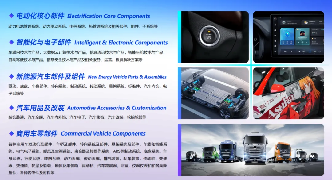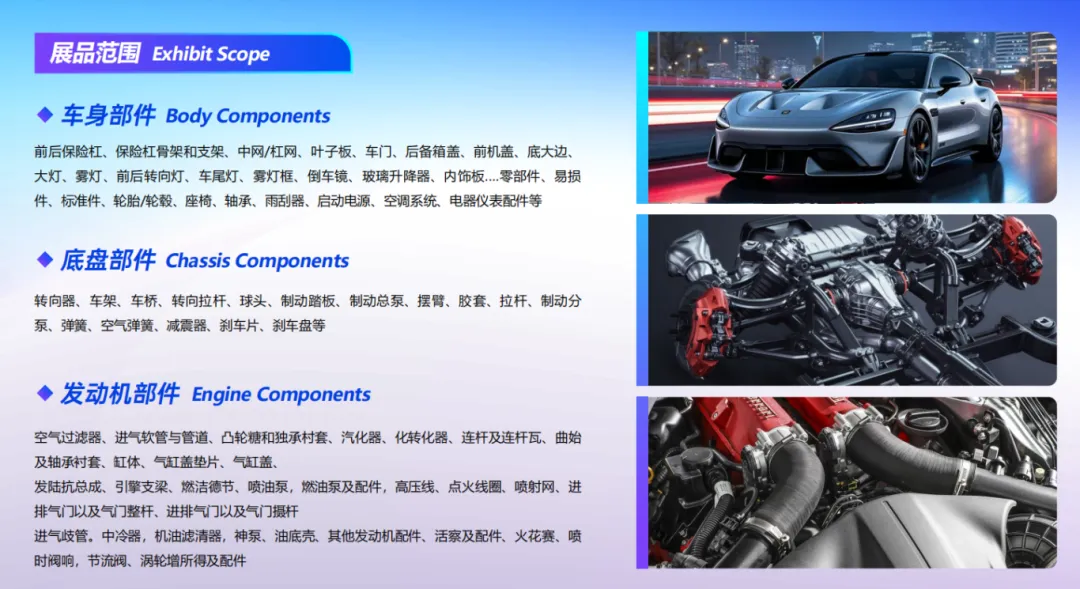 ✅ 全品类覆盖,适配多元需求:展会涵盖车身部件、底盘部件、智能化与电子部件、汽车用品改装、新能源汽车部件等全产业链展区,完美适配汽配用品、汽车美容、改装等多品类企业参展需求。