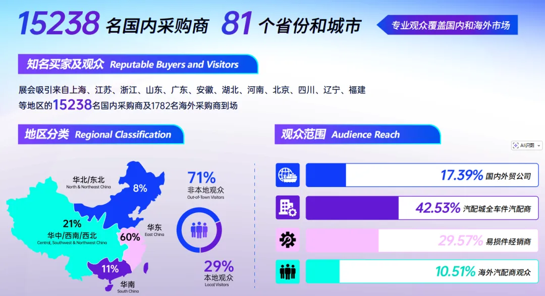 ✅ 行业标杆,出海优选:2025年展会规模60000㎡,吸引1800+参展企业、35000+专业观众,其中海外采购商1782家,覆盖全球61个国家和地区,是汽配企业链接全球订单的优质平台。