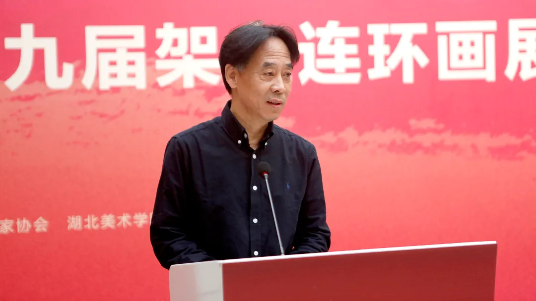 湖北美术学院党委副书记、院长周峰首先对莅临开幕式的各级领导、嘉宾、艺术家及媒体朋友表示热烈欢迎,同时向中国美术家协会、武汉经开区、汤湖美术馆以及湖北美术学院绘画学院的辛勤付出致以诚挚感谢。他在致辞中表示,连环画是绘画领域极具特色的重要表现形式,自诞生以来便伴随国家社会进步历程,不仅承载着文化繁荣的使命,更记录了党领导广大人民群众奋斗的百年征程。希望本届展览为湖北地区文化繁荣注入新活力,搭建全国性的连环画学术交流平台,携手各界同仁共同探索连环画艺术在新时代的创新表达路径。
