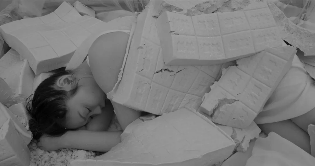 The work, "Drown" (2021), is a series of performance works by Chen Qiulin in response to the intensification of collective emotion since COVID-19. She chose tofu, a medium she has used for nearly 20 years, as the performance prop. Through cooperation with dance artist Zheng Yuanyuan and sound artist Chen Hongli, she tried a collective creation for the first time, and even transferred the focus of her work to the co-creator.