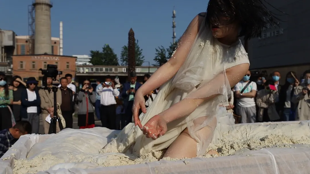 After Chen Qiulin setup the props based on tofu and its mold and briefly stated her ideas, the live performance was brought to be played by dancer Zheng Yuanyuan and sound artist Chen Hongli. Between them - whether between the body and tofu, or between the sound and dance - there is collision, stickiness and blending... In this humble temporary stage, the originally fragile tofu is mixed with "maladjusted" sound, as if surrounded by dangerousunpredictablewater(Ruo Shui). What the performer shows here is not so much a poem of body and perception as a tragic struggle. As a result, these were not expected by Chen Qiulin, she was also submerged by the performances of the two participating artists as an audience.
