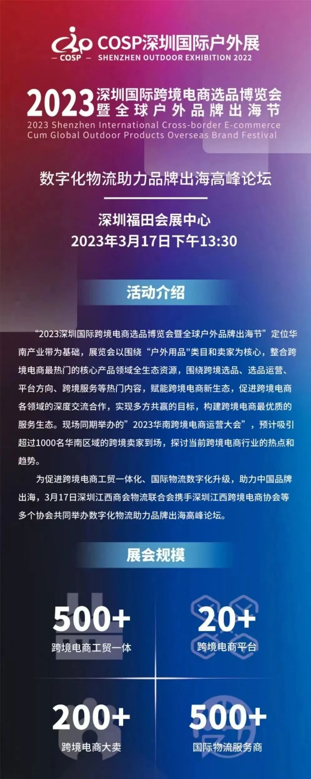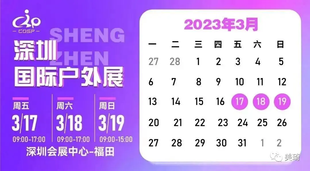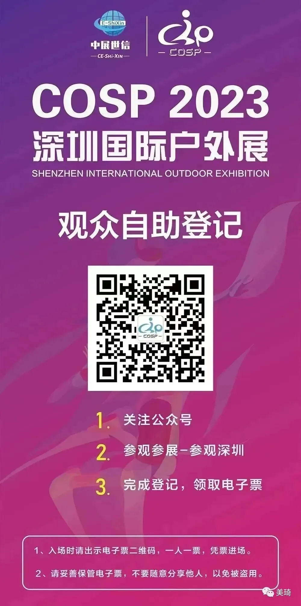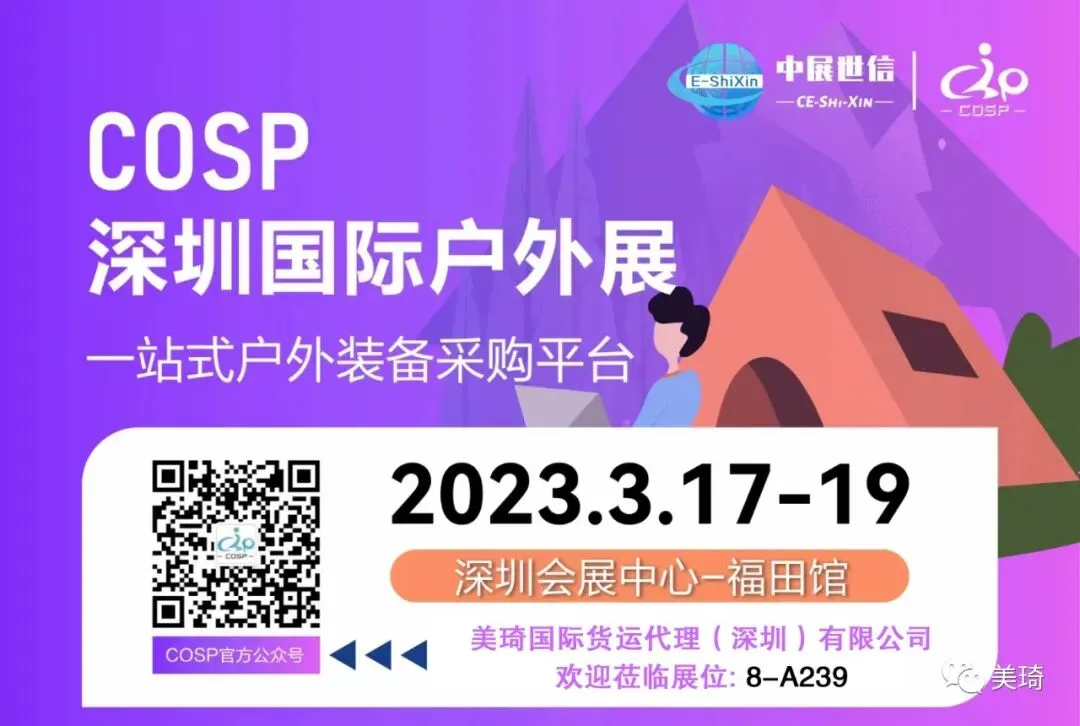 您好!我司美琦国际货运代理(深圳)有限公司诚挚邀请您参观COSP举办的深圳国际户外展。3月17日开始,为期三天连续举办,地点是深圳会展中心福田馆,届时欢迎您莅临我司展位8-A239。