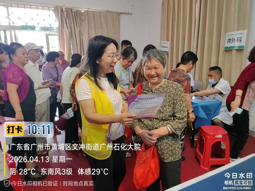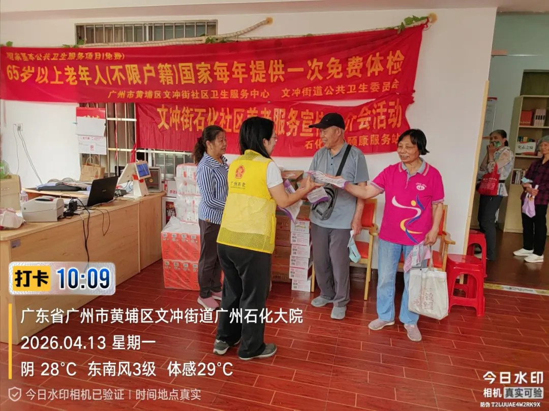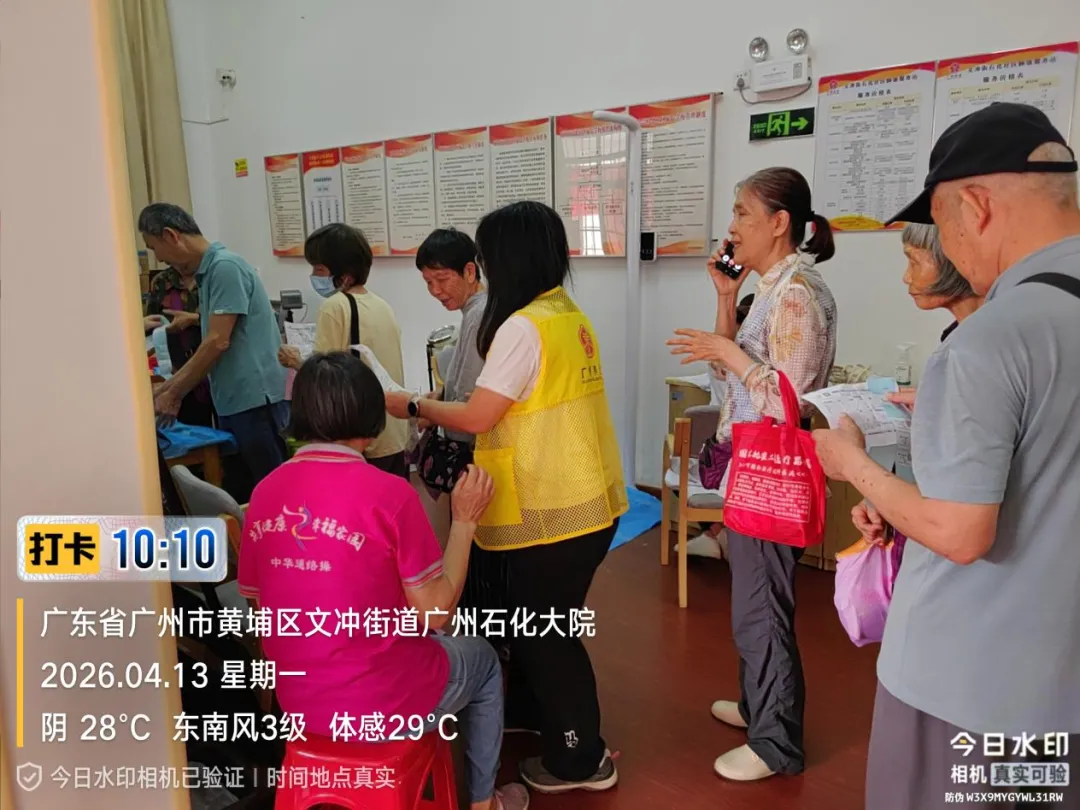 为进一步提升社区养老服务水平,切实关爱辖区老年居民健康,2026 年 4 月 13 日,石化社区颐康服务站联合广州市黄埔区文冲街社区卫生服务中心在站内开展了养老服务宣传推介会暨 65 岁以上老年人免费体检活动,吸引了 80 余名老年居民积极参与。