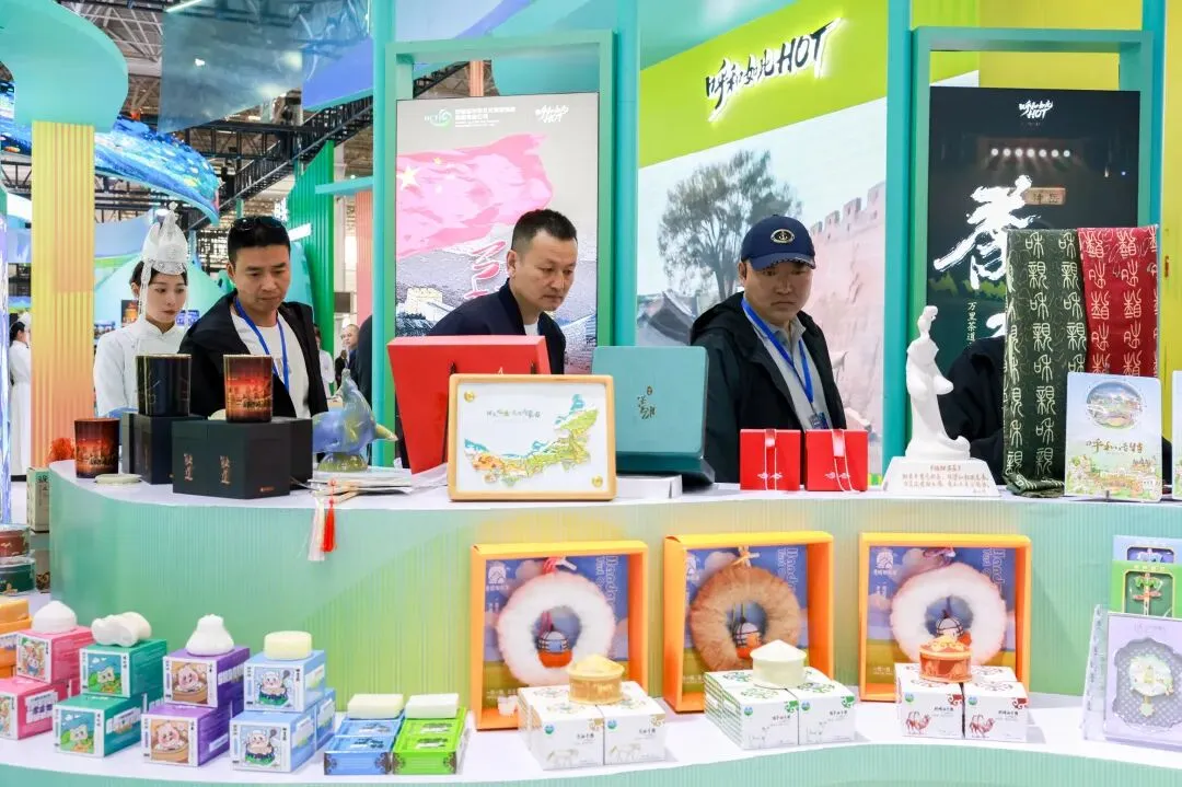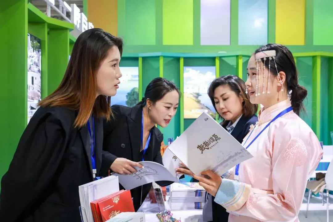 参展商在呼和浩特展区了解文创产品。