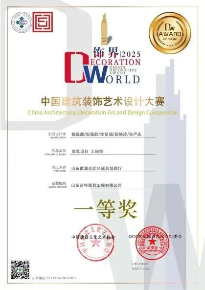 近日,由山东百特展览工程有限公司精心打造的《山东能源西北区域总部展厅》展览空间作品,凭借卓越的设计水准、精湛的工程落地能力以及鲜明的创作特色,经CBDA中国建筑装饰艺术设计大赛评审专家组的多轮评审,成功斩获中国建筑装饰艺术设计大赛展览项目工程类一等奖,彰显了企业在展陈设计领域的行业影响力与核心竞争力。