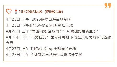 15号馆:跨境出海论坛区 + 平台官方对接 + 源头工厂展示