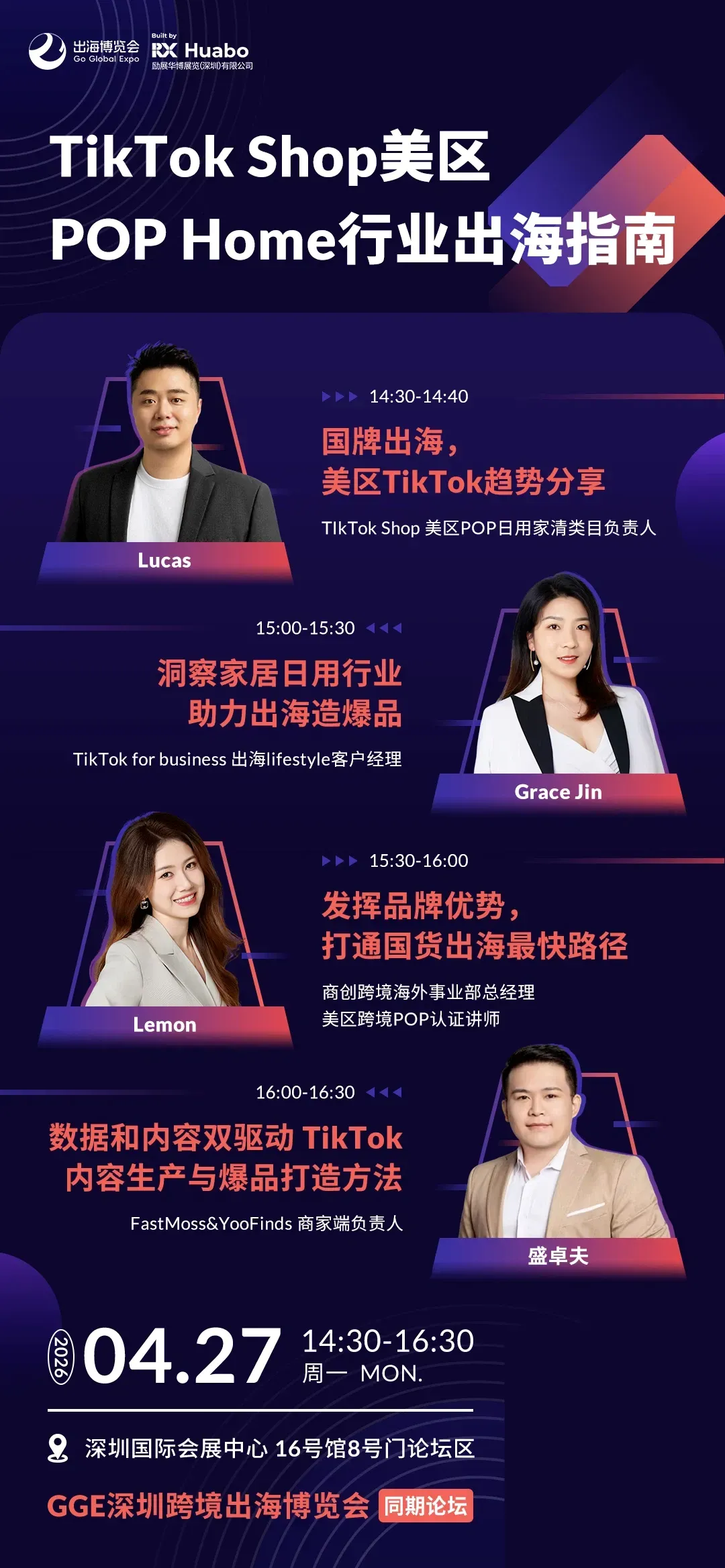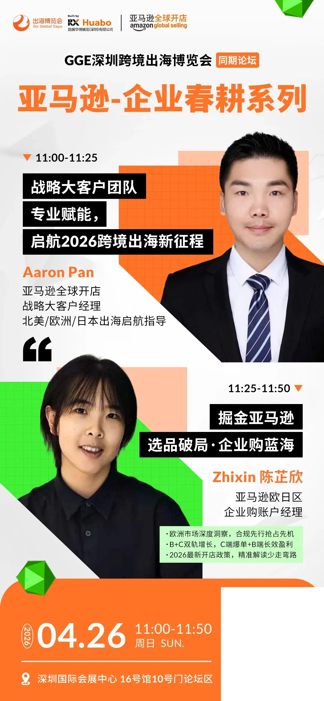 亚马逊、SHEIN、TEMU、TikTok Shop 等全球主流及新兴平台官方入驻,招商与品类经理现场坐镇,解读最新政策、分享品类需求、传授运营策略,可直面平台决策者,破解审核、运营瓶颈,享受绿色通道。