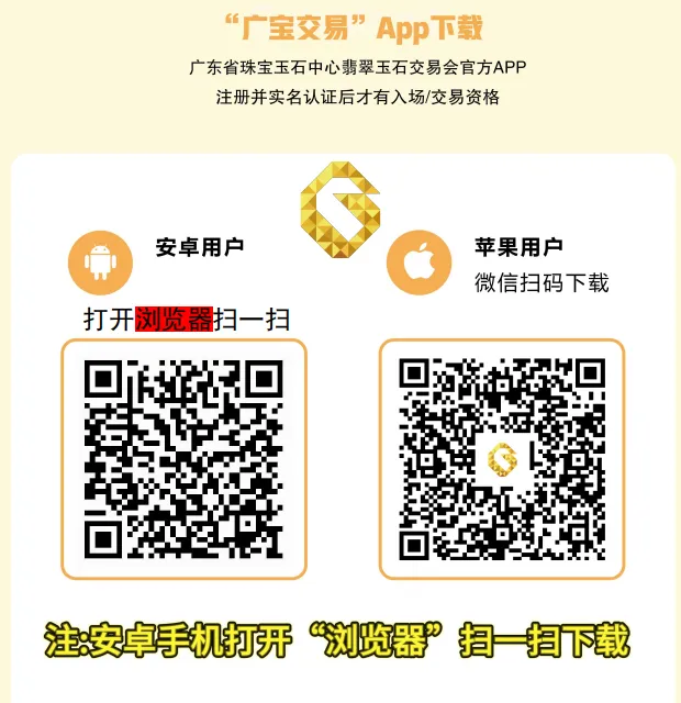 玉商投标前请先下载“广宝交易”APP。请扫描以下二维码,下载本次交易会专用APP并完成注册和认证后获得竞价资格。请在线上缴纳竞价保证金后到财务处领取纸质竞价单填表投标