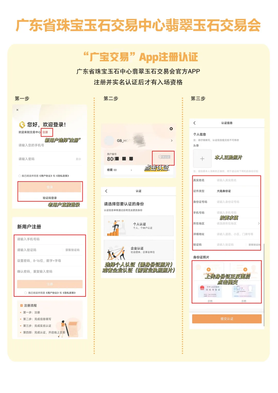 交易会采用会员制模式,须是广宝中心会员和揭阳市珠宝玉器商会会员,方可进场看货及参与投标。如需办理广宝中心会员,请参照本公告第六点进行注册认证,或在活动现场咨询办理;如需注册揭阳市珠宝玉器商会会员证的玉商,请持有效身份证原件、复印件和大一寸证件照1张,前往阳美中国玉都展销中心三楼——揭阳市珠宝玉器商会申请办理。如有疑问请咨询0663-8801088。