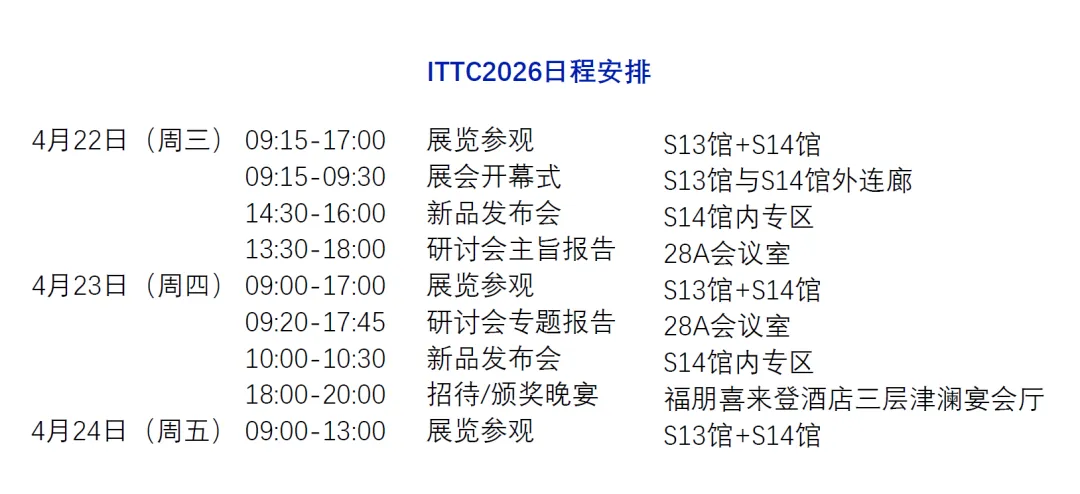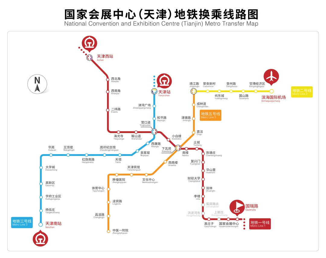 3.天津南站:搭乘出租车或地铁到国家会展中心(天津)。地铁路线:天津南站地铁站(乘坐3号线小淀方向)→营口道(转乘1号线双桥河方向)→1号线“国瑞路”地铁站C出口(离ITTC2026入口更近)