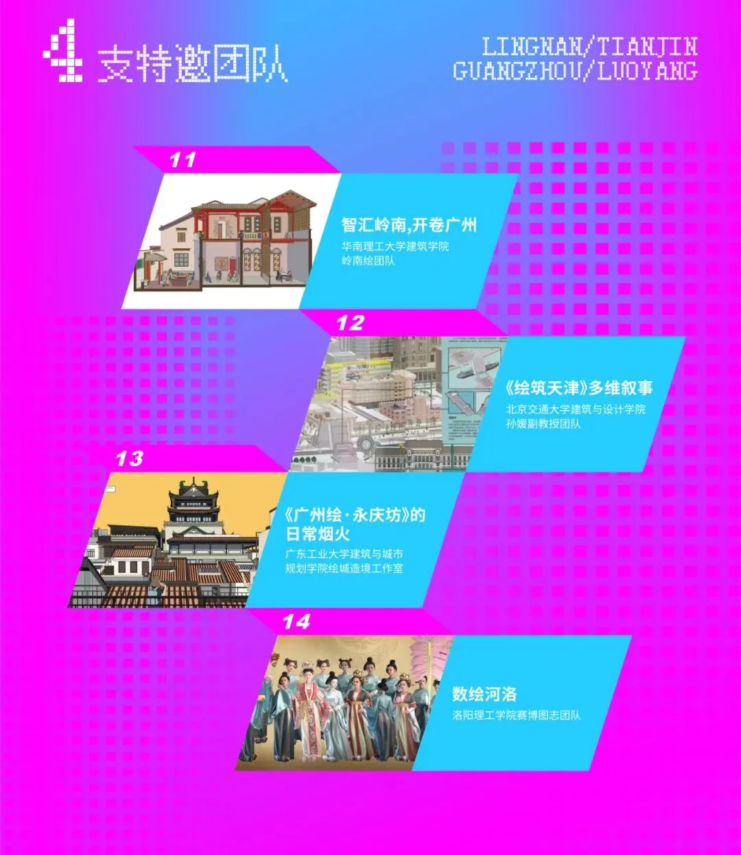 另有4支特邀团队从岭南、中原、华北远道而来,带来余荫山房的园林智慧、永庆坊的烟火叙事、河洛文明的数字活化与天津城市记忆的可视化转译。