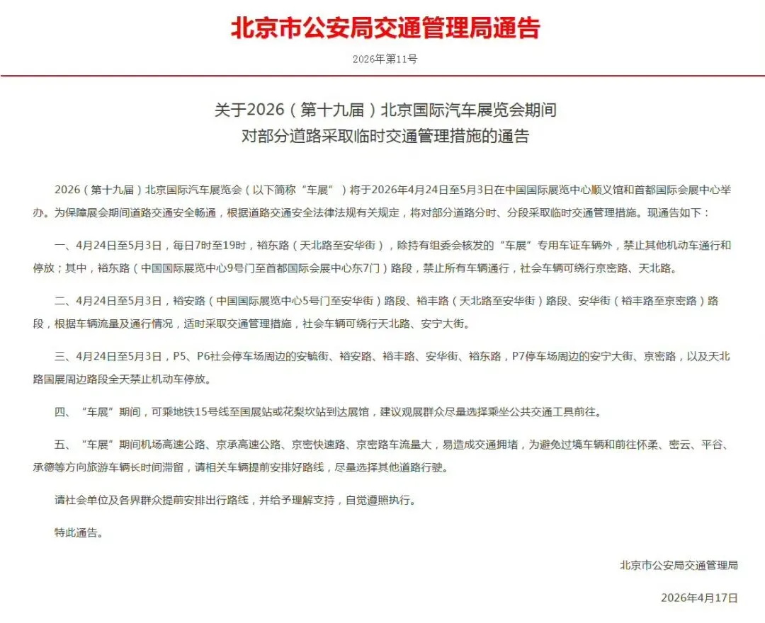 2026(第十九届)北京国际汽车展览会(以下简称“车展”)将于2026年4月24日至5月3日在中国国际展览中心顺义馆和首都国际会展中心举办。为保障展会期间道路交通安全畅通,根据道路交通安全法律法规有关规定,将对部分道路分时、分段采取临时交通管理措施。现通告如下: