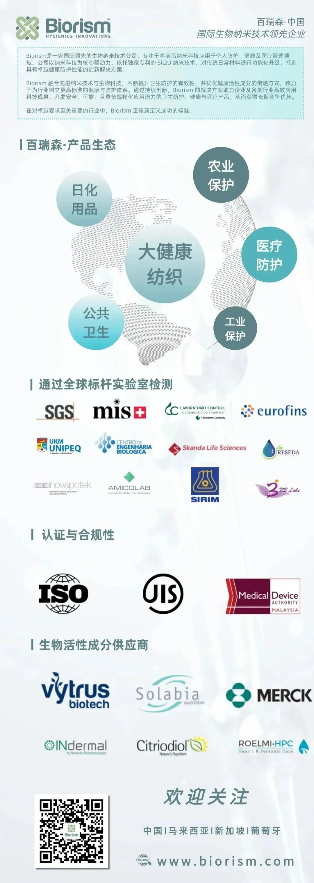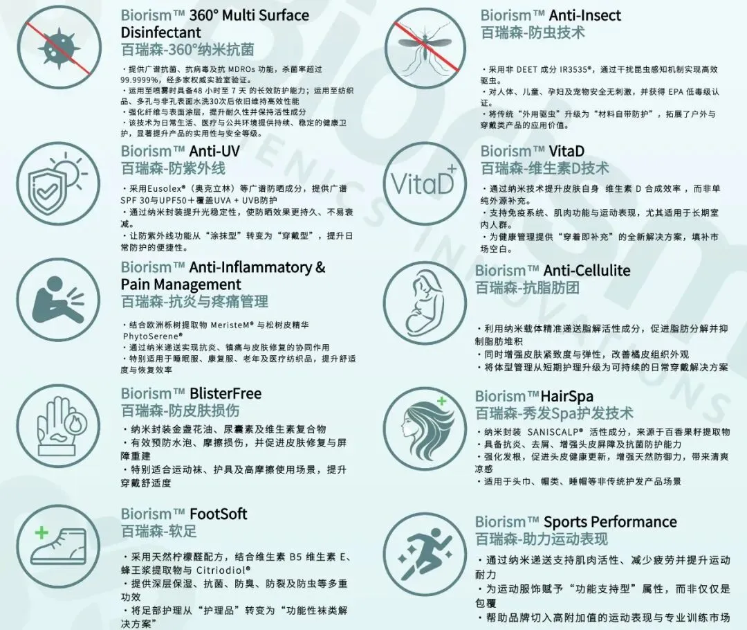 基于这一趋势,百瑞森所构建的生物纳米技术体系,正在展现出更为清晰的应用逻辑:通过纳米载体,将多种经过验证的活性成分稳定结合于纺织材料,实现长效释放与精准作用,使织物从“被动防护工具”转变为“主动健康载体”。