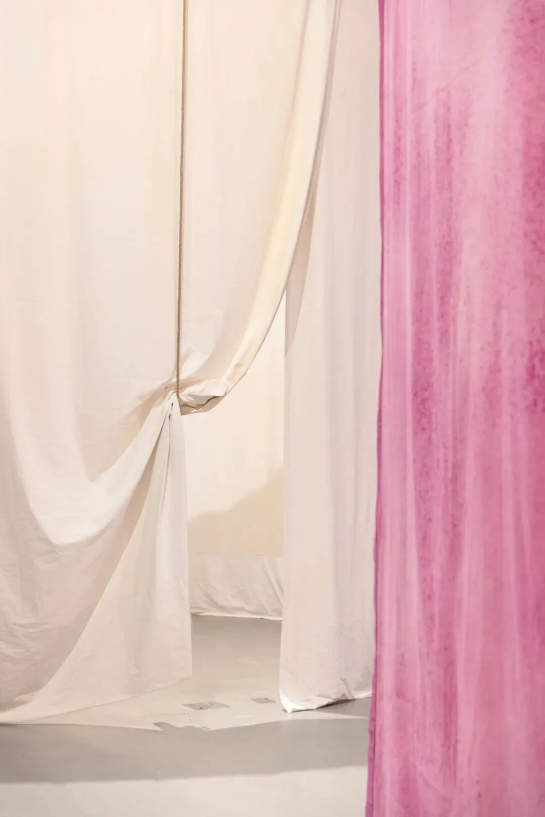 乌拉·冯·勃兰登堡在多块幕布组成的空间装置中,回应了一个不可忽视的理论维度——即德勒兹的“皱褶理论”(The Fold)。多重幕布不再是平面的分割,而是“皱褶”的具体化。冯·勃兰登堡以幕布创造了一个“临时的软建筑空间”——在幕布之间的缝隙中“具体化了人类的运动过程”,每一层幕布象征着一个经验的阶段,是“介于幻想与现实之间的媒介”。