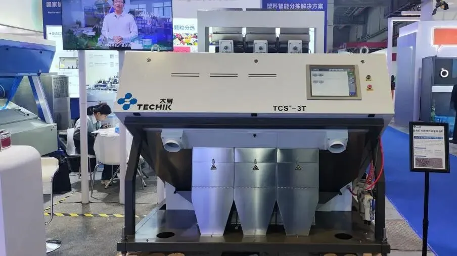 同步亮相的滑槽式小型紧凑款光学分选机采用高清成像系统,可准确识别细微颜色差异,单面色、双面色塑料片均适用,可应用于PET3A瓶片、PC、ABS、PS等废塑料片的浅色与杂质分选。