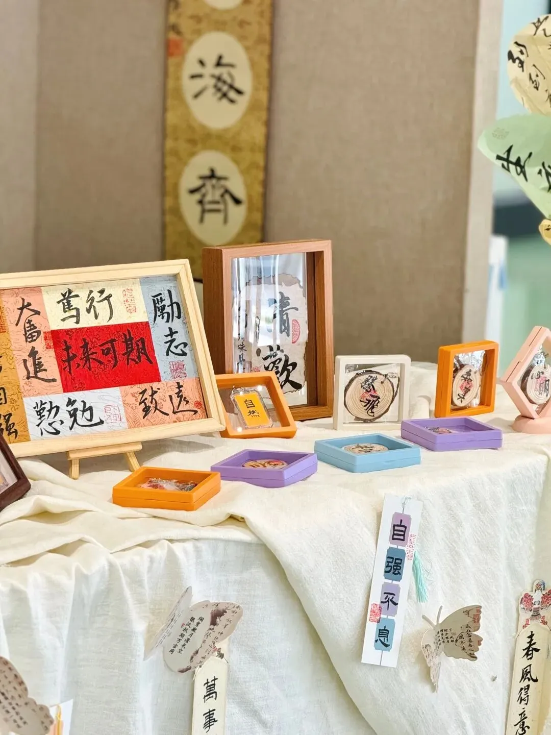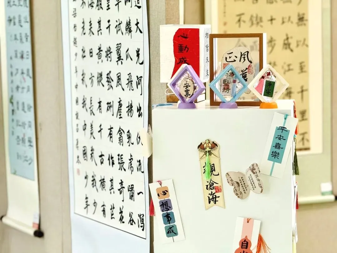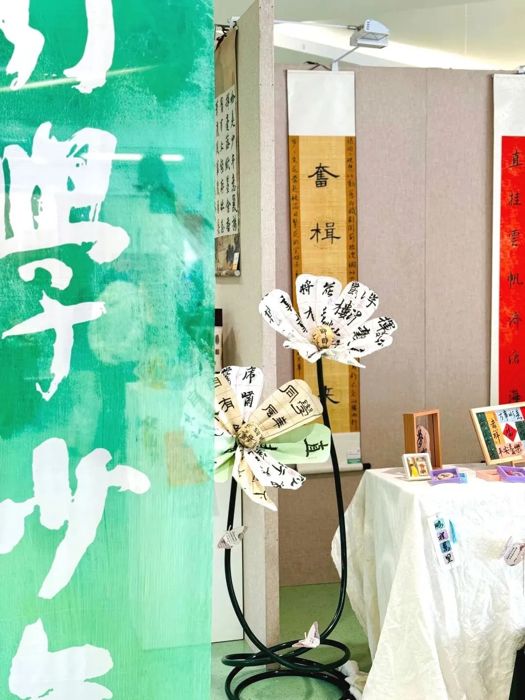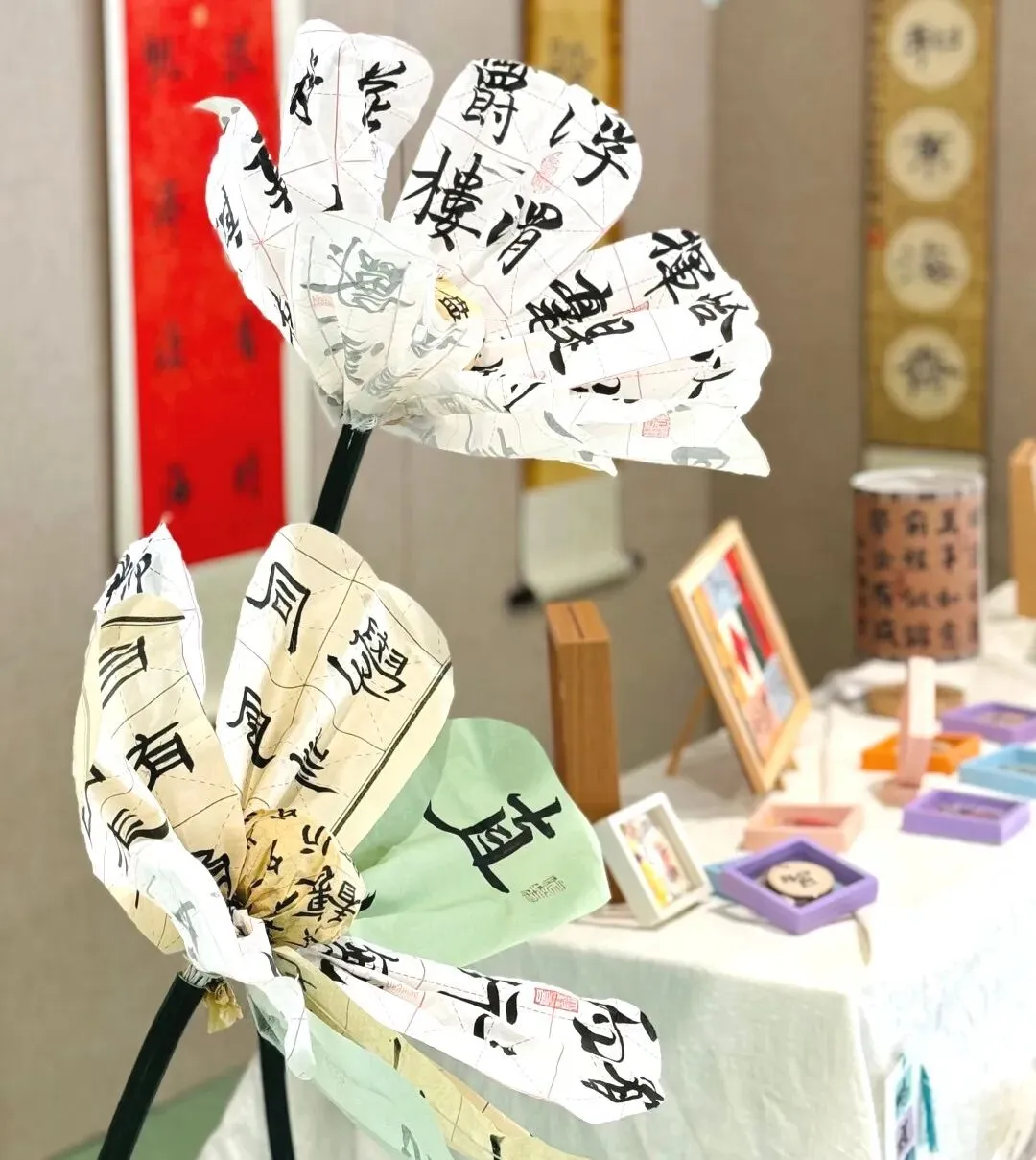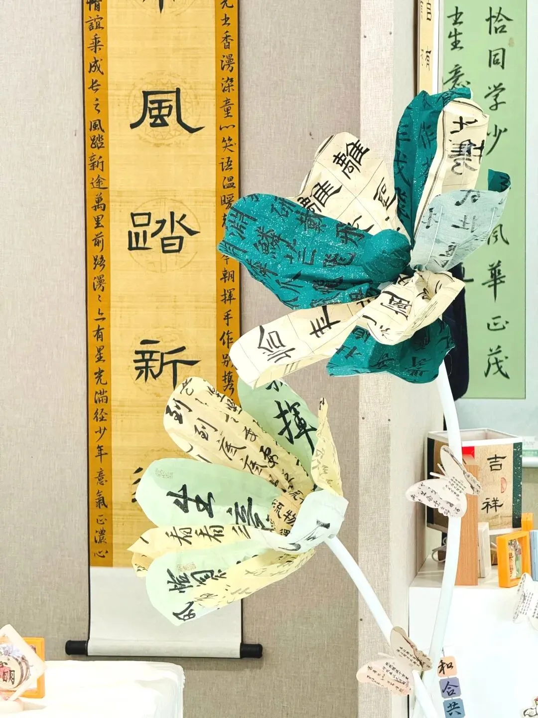 作品是展览的灵魂,更是情感的载体。传统书法区,楷书端庄、行书洒脱、隶书古朴,孩子们凝神落笔,将对母校的眷恋、对未来的期许藏进一撇一捺;文创区,书签、钥匙扣、墨韵台灯、摆件兼具美感与实用,每一件都凝聚着巧思;环保创意区,废旧练习纸被裁成花瓣拼接成花艺,保留的字迹见证着成长轨迹——“素笺笔墨,因热爱而滚烫,因情谊绵长而熠熠生辉。