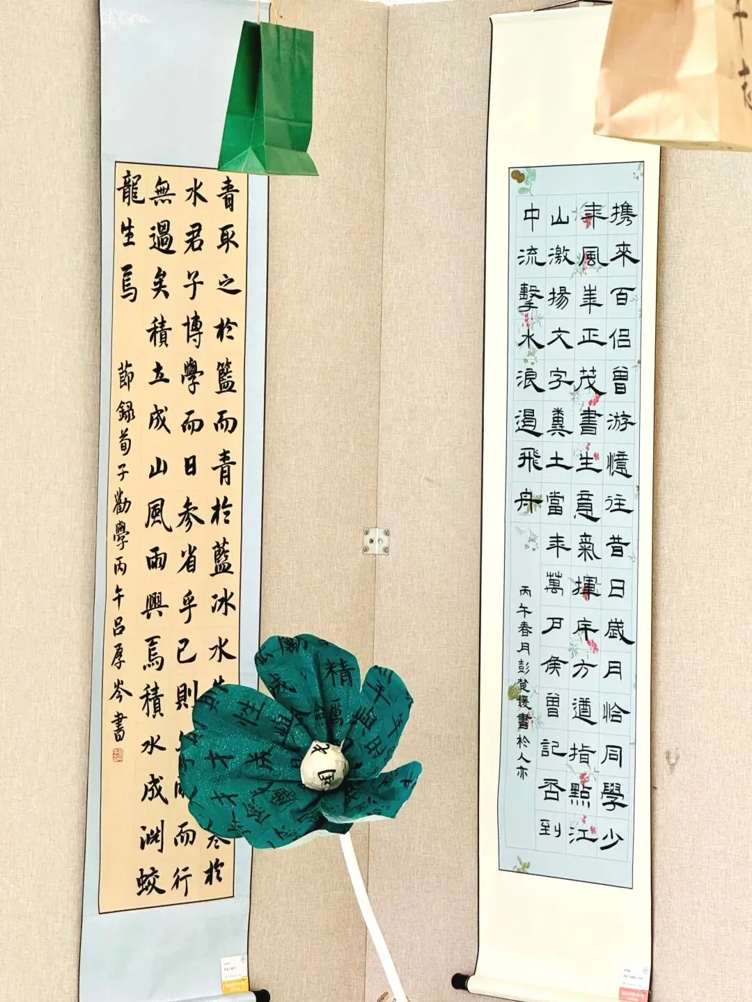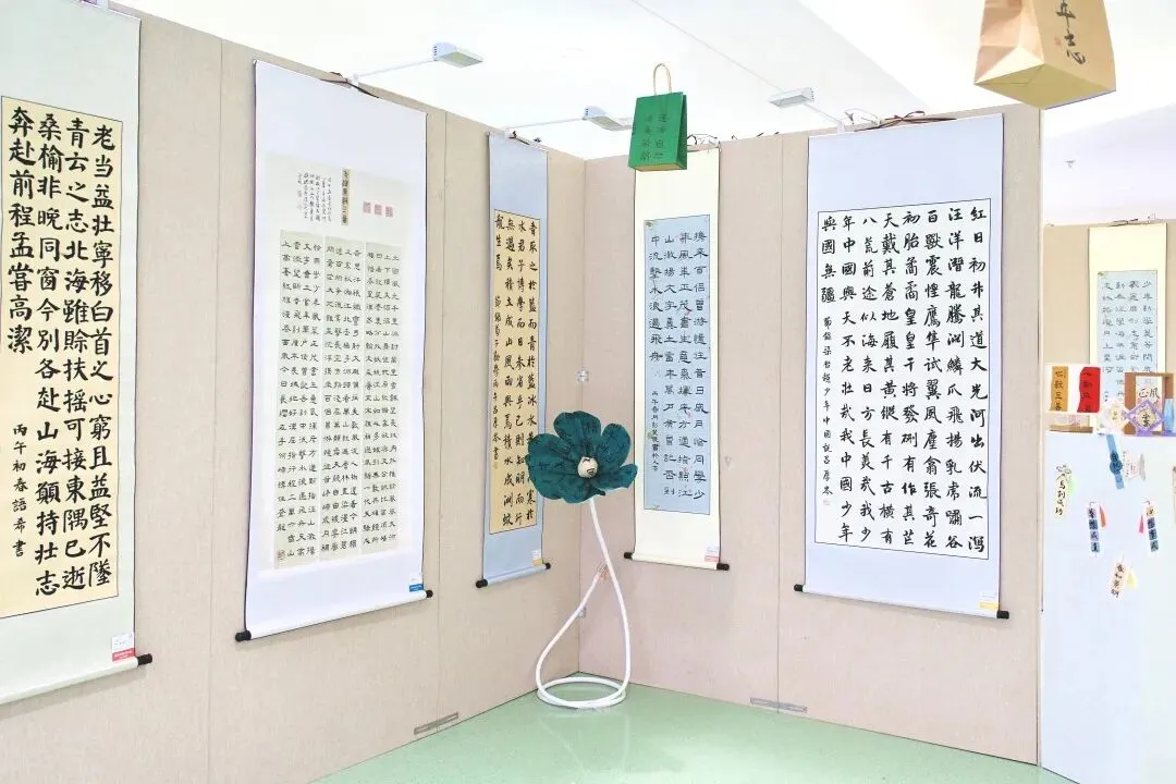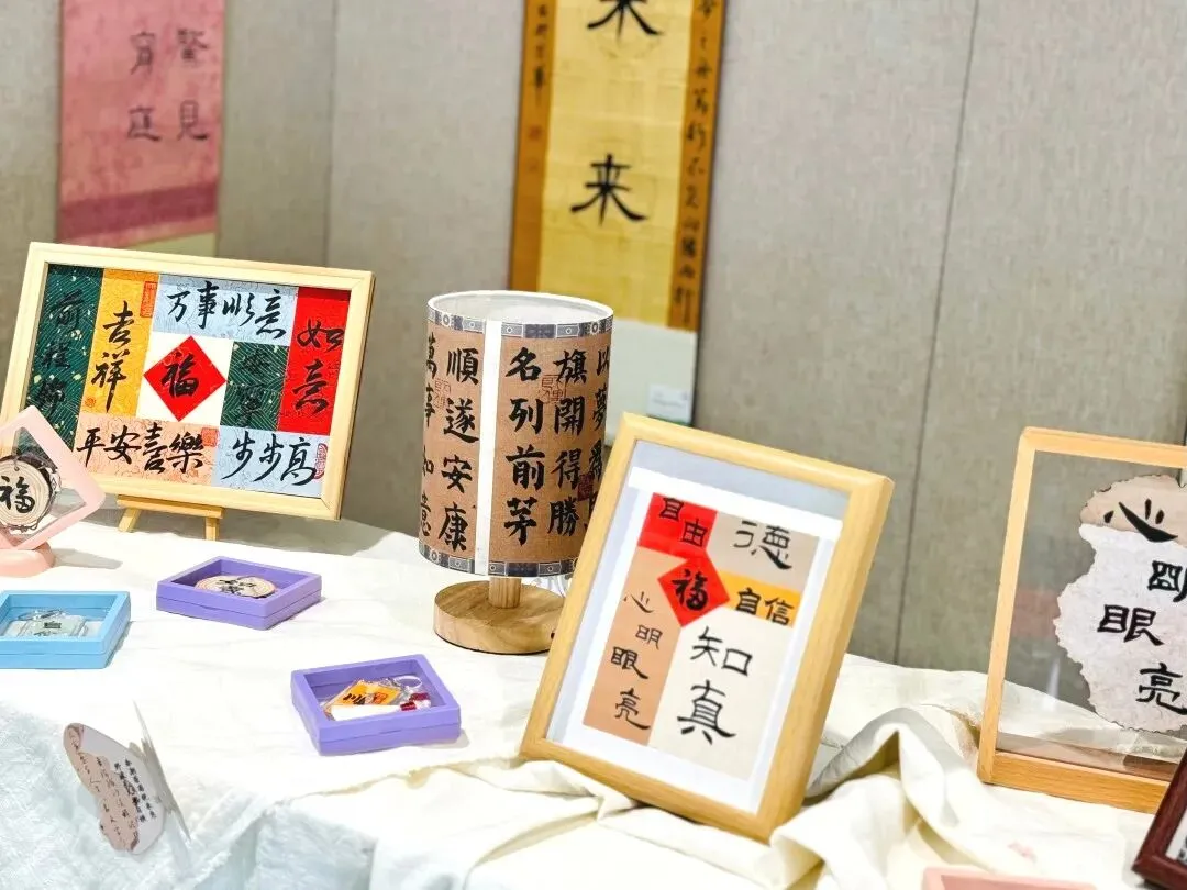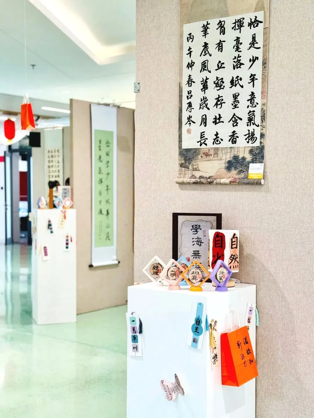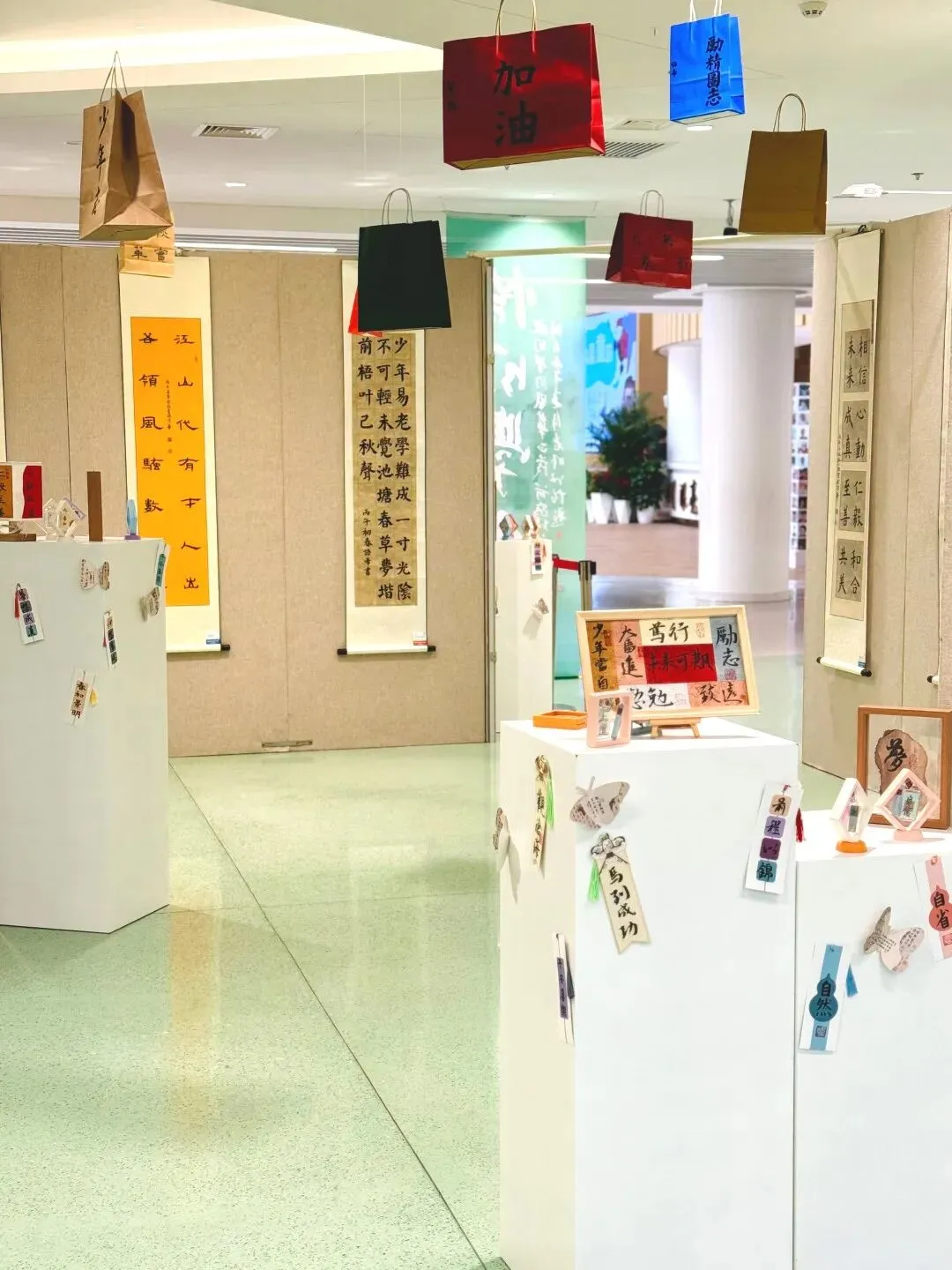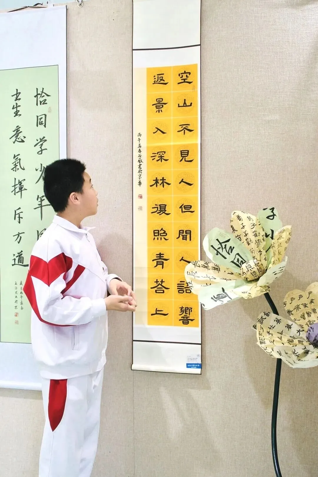 作品是展览的灵魂,更是情感的载体。传统书法区,楷书端庄、行书洒脱、隶书古朴,孩子们凝神落笔,将对母校的眷恋、对未来的期许藏进一撇一捺;文创区,书签、钥匙扣、墨韵台灯、摆件兼具美感与实用,每一件都凝聚着巧思;环保创意区,废旧练习纸被裁成花瓣拼接成花艺,保留的字迹见证着成长轨迹——“素笺笔墨,因热爱而滚烫,因情谊绵长而熠熠生辉。