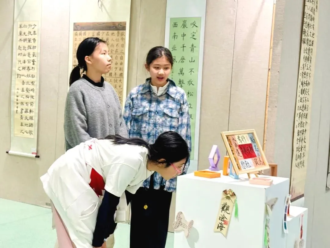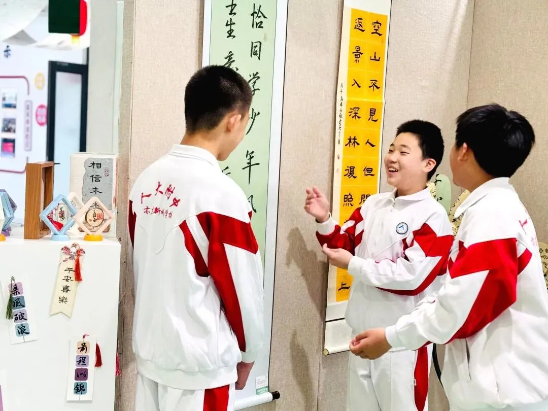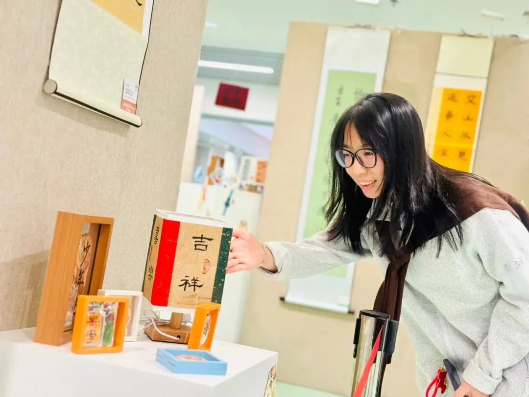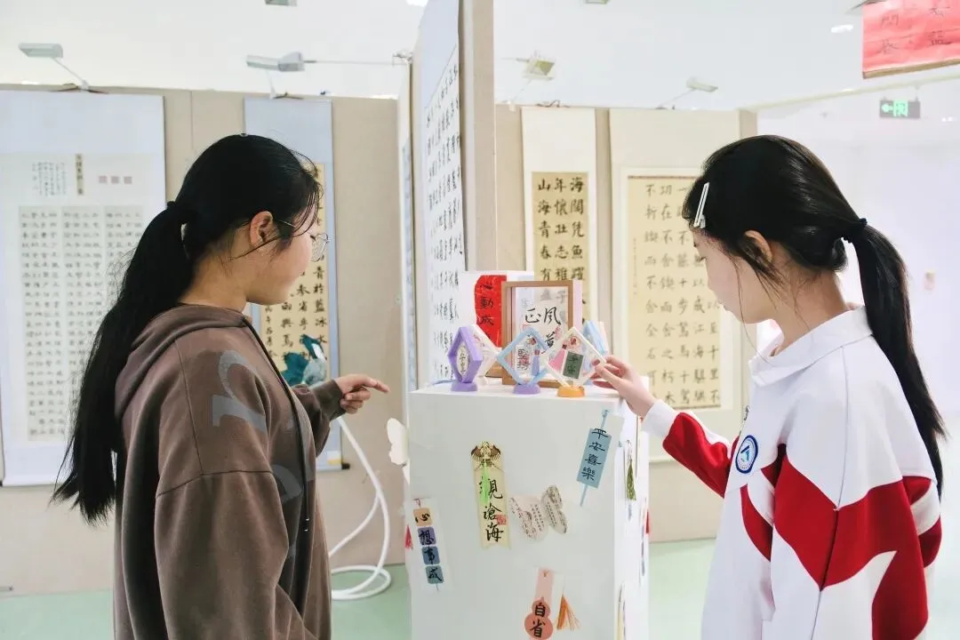 5名学子化身“小小讲解员”,自信分享创作故事,眼神里满是自豪。老师们亲临点赞,同学们驻足欣赏,互动环节中,文创作品成为传递祝福的使者,墨香里弥漫着不舍与珍重。