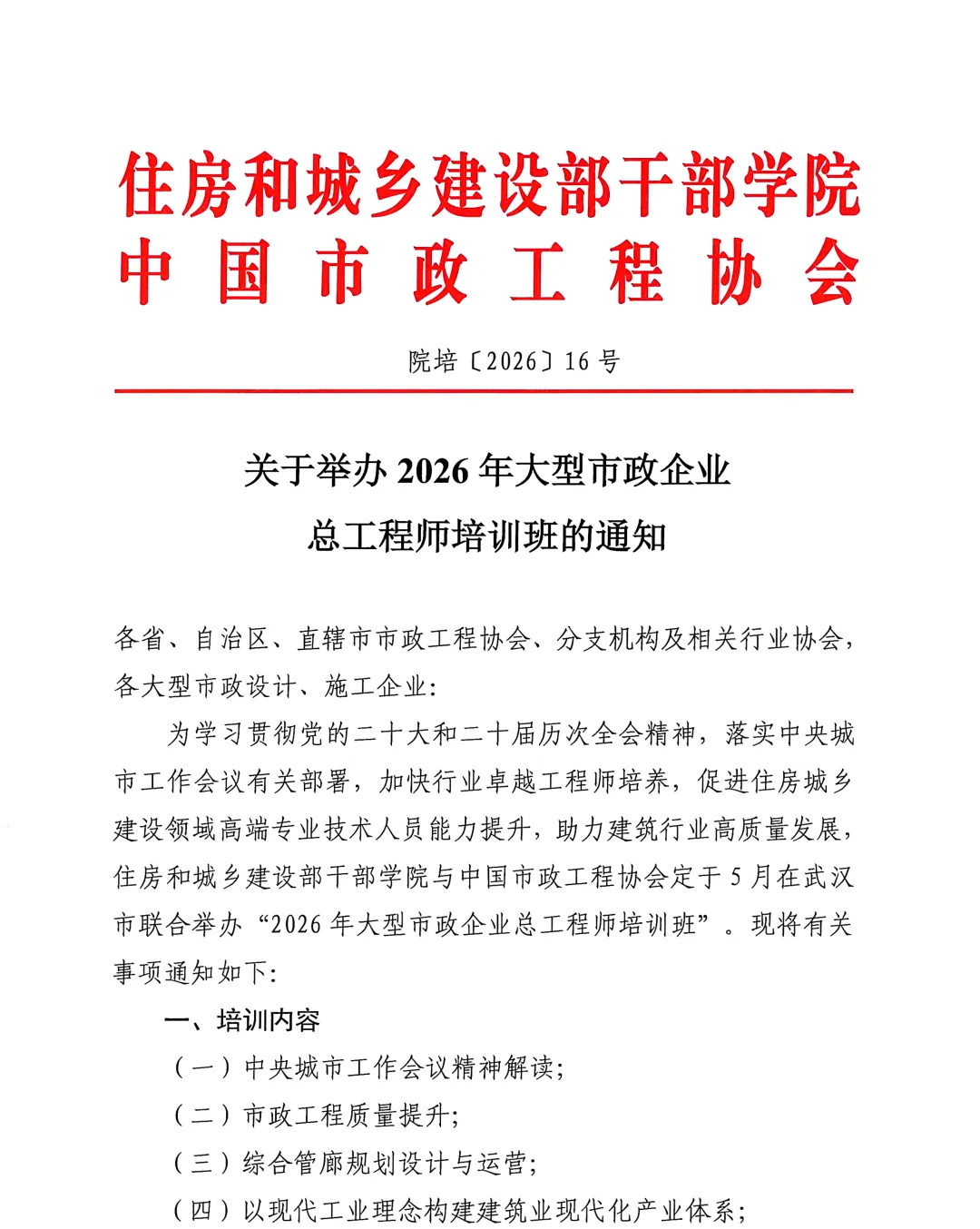 行业资讯丨关于举办2026年大型市政企业总工程师培训班的通知