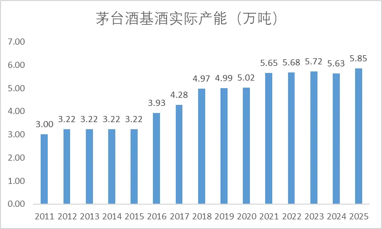 疫情后经济通缩,需求疲软,规上白酒企业从 1124 家减少至 887 家,亏损面 36.1%;总产量连续 10 年下滑至 354.9 万千升,仅为历史峰值的 30%。次高端酒企全面停止扩产,中小酒企出清加速;批价下跌引发渠道恐慌,全行业进入去库存周期;业绩下滑叠加估值杀跌。茅台动作:维持产能,2025 年底基酒产能 5.84 万吨。