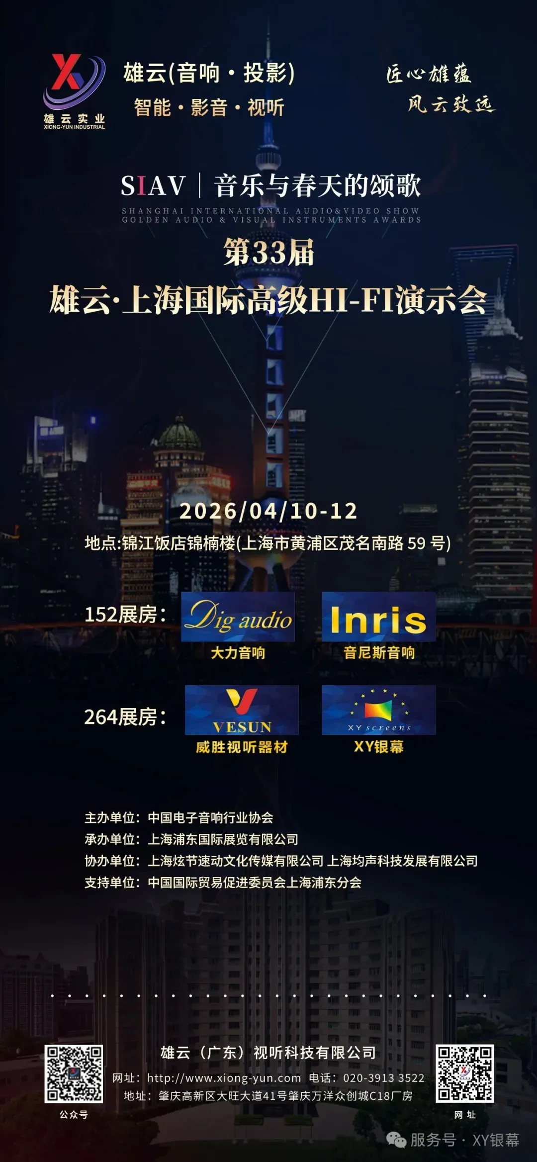 2026 SIAV上海国际影音展,雄云实业携旗下多个品牌应约而来,Dig audio 大力音响、Inris 音尼斯音响、XY银幕、VESUN威胜视听器材等品牌于上海与大家见面了。