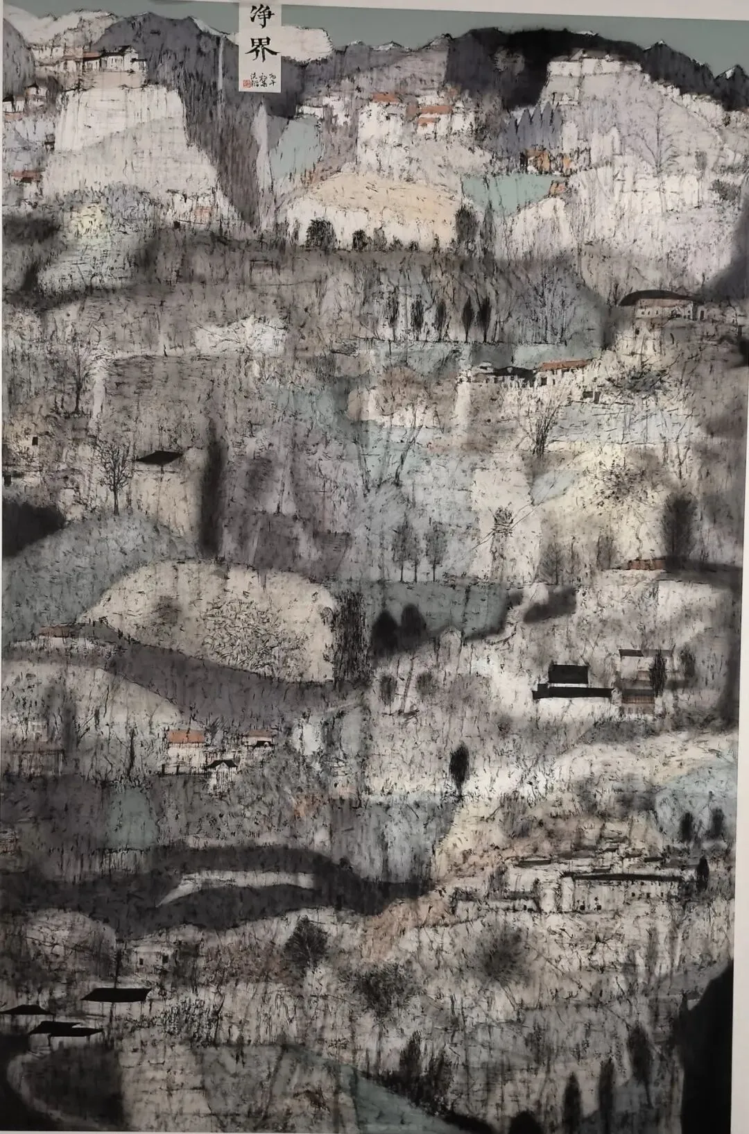 这幅《净界》笔墨以皴擦线条构筑肌理,黑白灰层次凝练。创意上打破传统山水程式,以抽象化的村落与山川,营造出静谧疏离的禅意意境,兼具现代构成感与东方诗性。
