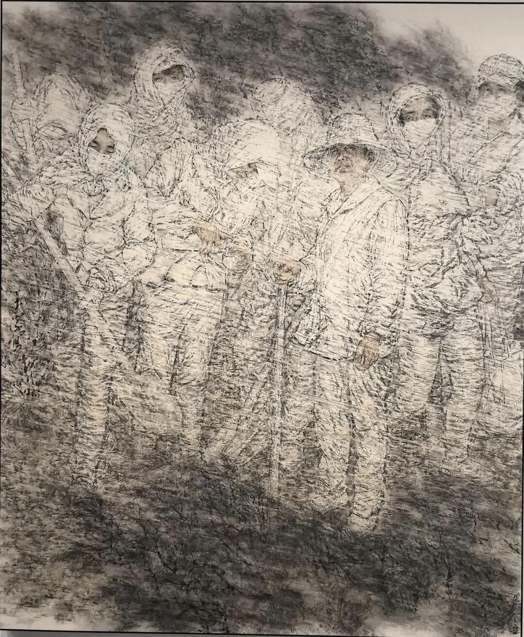 这幅作品以密集皴擦的枯笔营造朦胧质感,笔墨沉涩苍劲,极具张力。创意上以模糊的群像聚焦劳动者群像,弱化个体细节却凸显群体的坚韧力量,水墨语言与人文主题浑然一体。