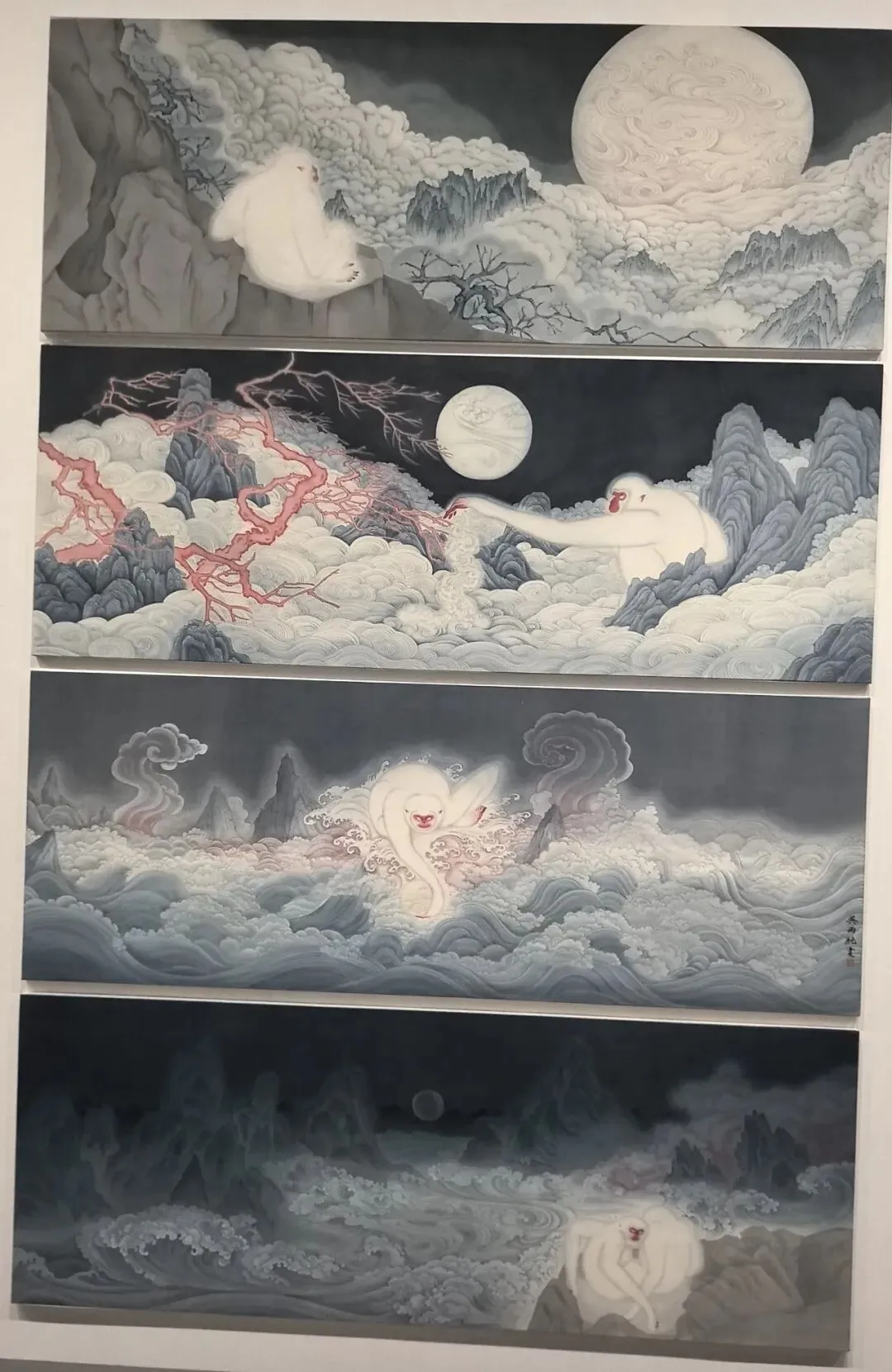 这组工笔设色画笔墨细腻,线条匀净,晕染柔和,层次过渡自然。创意上以白猿与月、云、水的四幅连作构建叙事,营造空灵神秘的东方意境,传统工笔语言与当代奇幻意象相融。