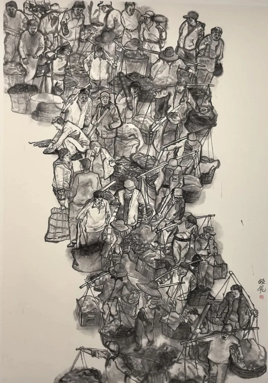 此作以焦墨枯笔勾线,线条涩劲顿挫,皴擦兼施,墨色浓淡对比强烈,尽显劳作艰辛。创意上以密集人群与扁担构筑视觉肌理,聚焦底层劳动者,以群像叙事还原市井烟火,兼具写实力量与人文温度