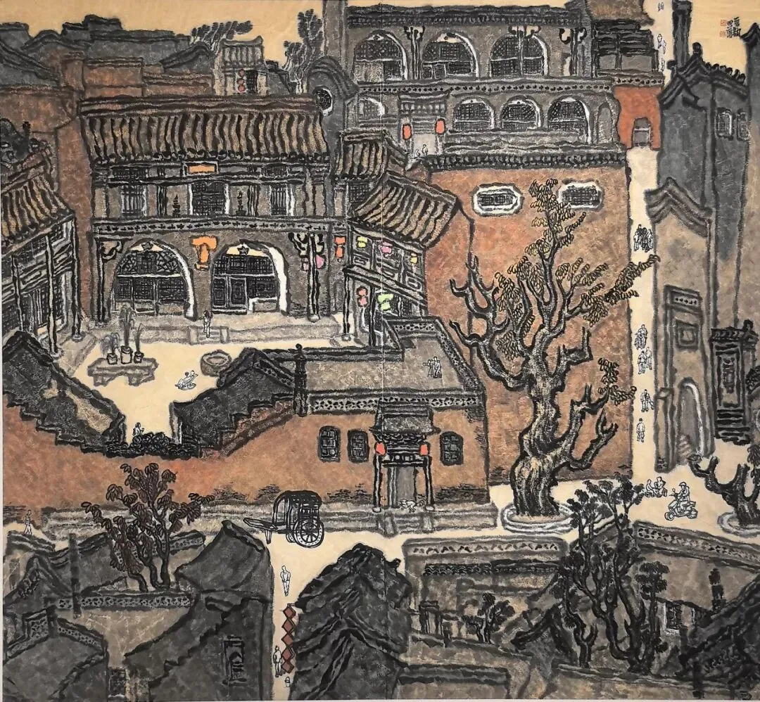 此作笔墨朴拙厚重,以焦墨勾勒民居轮廓,皴擦点染出古建肌理,设色沉稳暖雅。创意上融传统民居风貌与市井烟火,以现代视角重构古村图景,兼具乡土情怀与形式美感。
