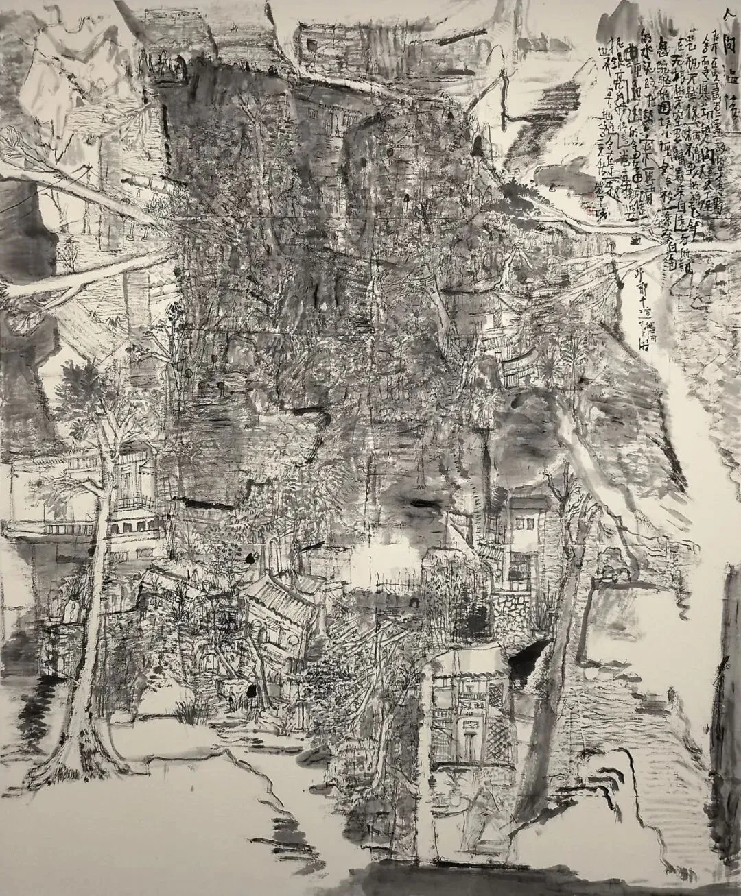 此作笔墨奔放洒脱,以枯笔、皴擦与泼墨交织,线条苍劲而富于变化。创意上打破传统山水范式,以密集的建筑与树木构建虚实相生的家园图景,兼具书写性与当代性。