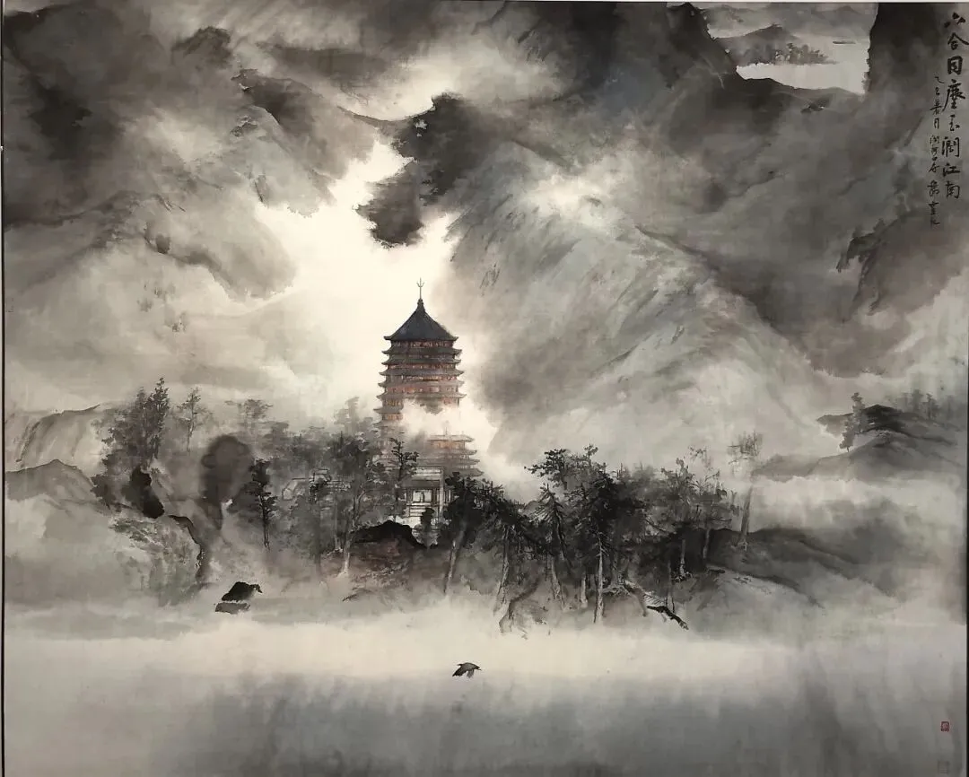 此作以泼墨渲染营造烟雨氤氲的朦胧意境,墨色浓淡层次丰富,塔影以淡赭轻染,虚实相生。创意上借云雾中的古塔与孤鸟,将江南山水的空灵诗意与禅意哲思相融,意境悠远。
