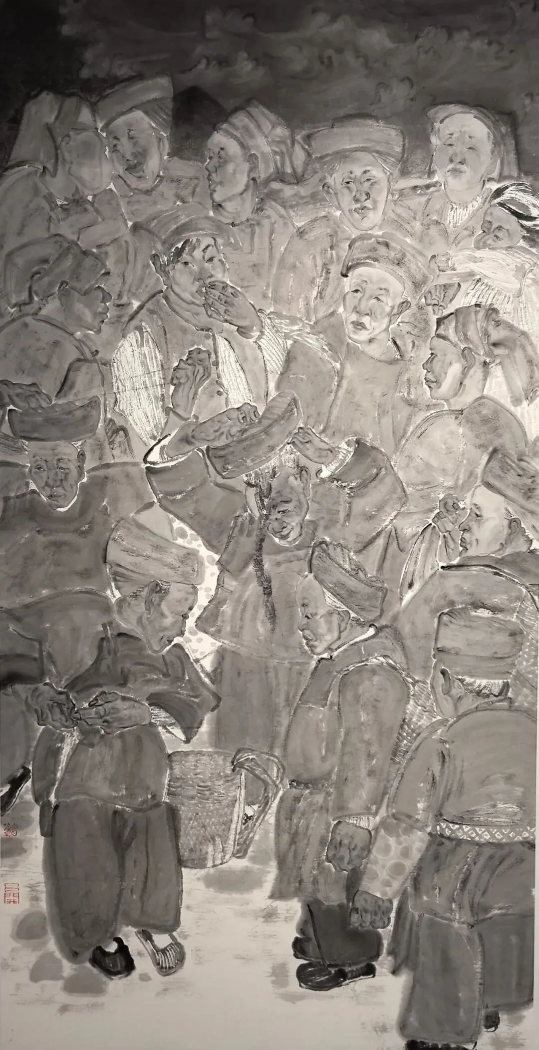 此作以水墨写意的笔墨语言,用浓淡变化与皴擦塑造群像,线条拙朴而富有张力。创意上聚焦少数民族群像,以动态捕捉民俗瞬间,在黑白灰中传递质朴的生活温度与人文情怀。