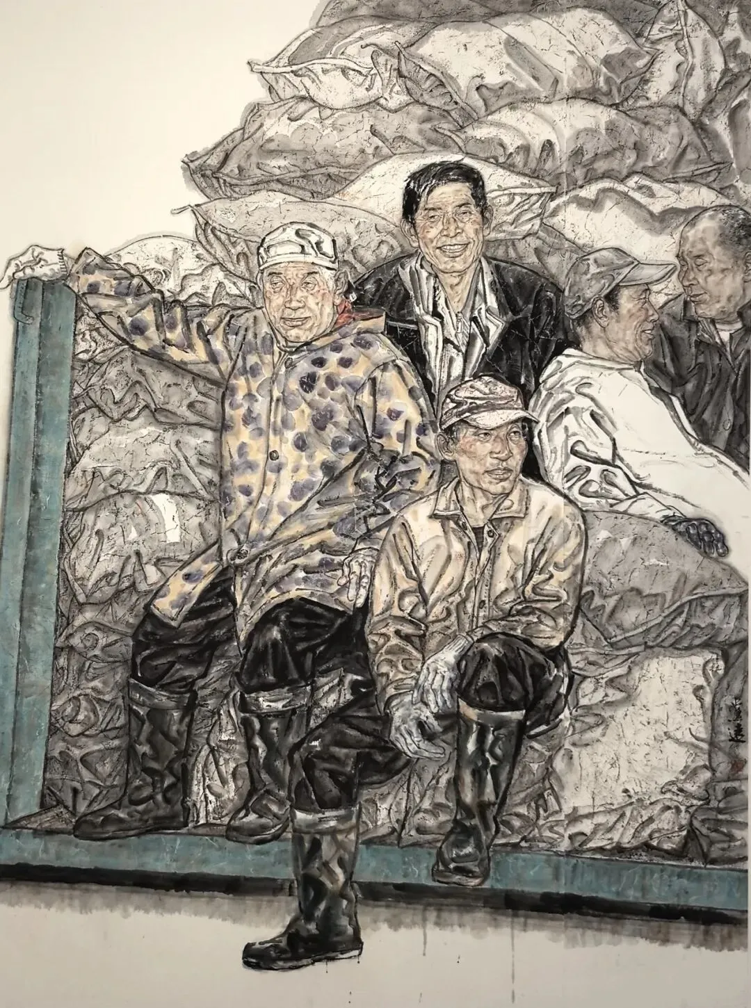 此作笔墨苍润,线条勾勒人物轮廓,皴擦与淡彩结合,塑造出劳动者的质朴质感。创意聚焦普通劳动者群像,以真实神态与场景传递民生温度,兼具写实功力与人文关怀。