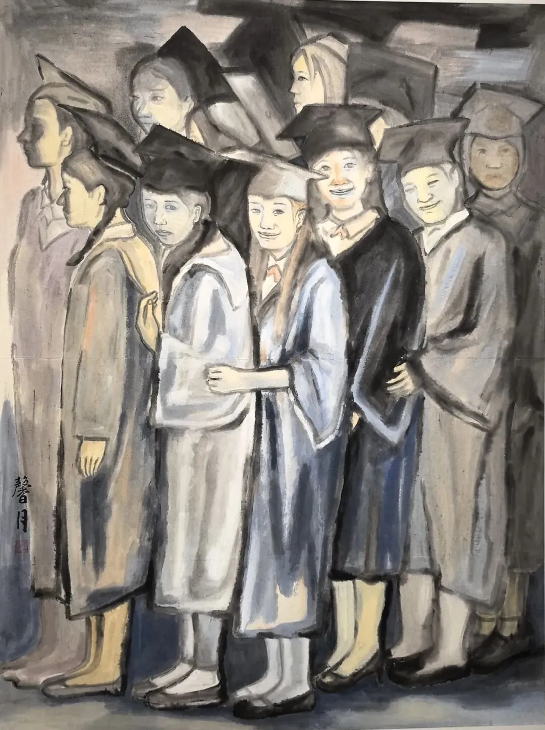 此作以淡墨晕染肤色,线条柔和简练,色调清雅温润。创意上聚焦毕业群像,捕捉学子微笑瞬间,以现代水墨语言诠释青春朝气,兼具写实性与抒情性。