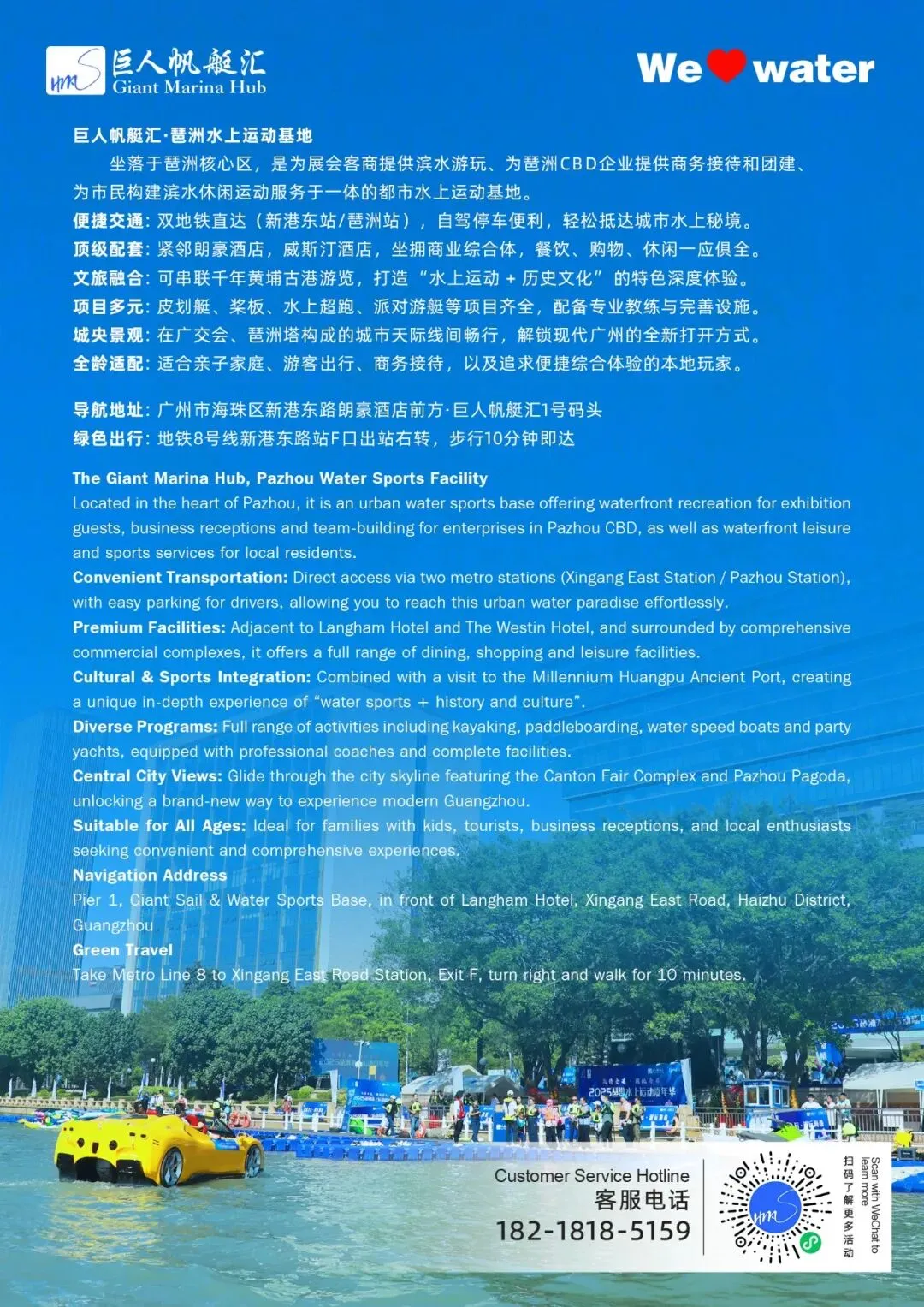 巨人帆艇汇·琶洲水上运动基地,坐落于琶洲核心区,是为展会客商提供滨水游玩、为琶洲CBD企业提供商务和接待和团建、为市民构建滨水休闲运动服务于一体的都市水上运动基地。