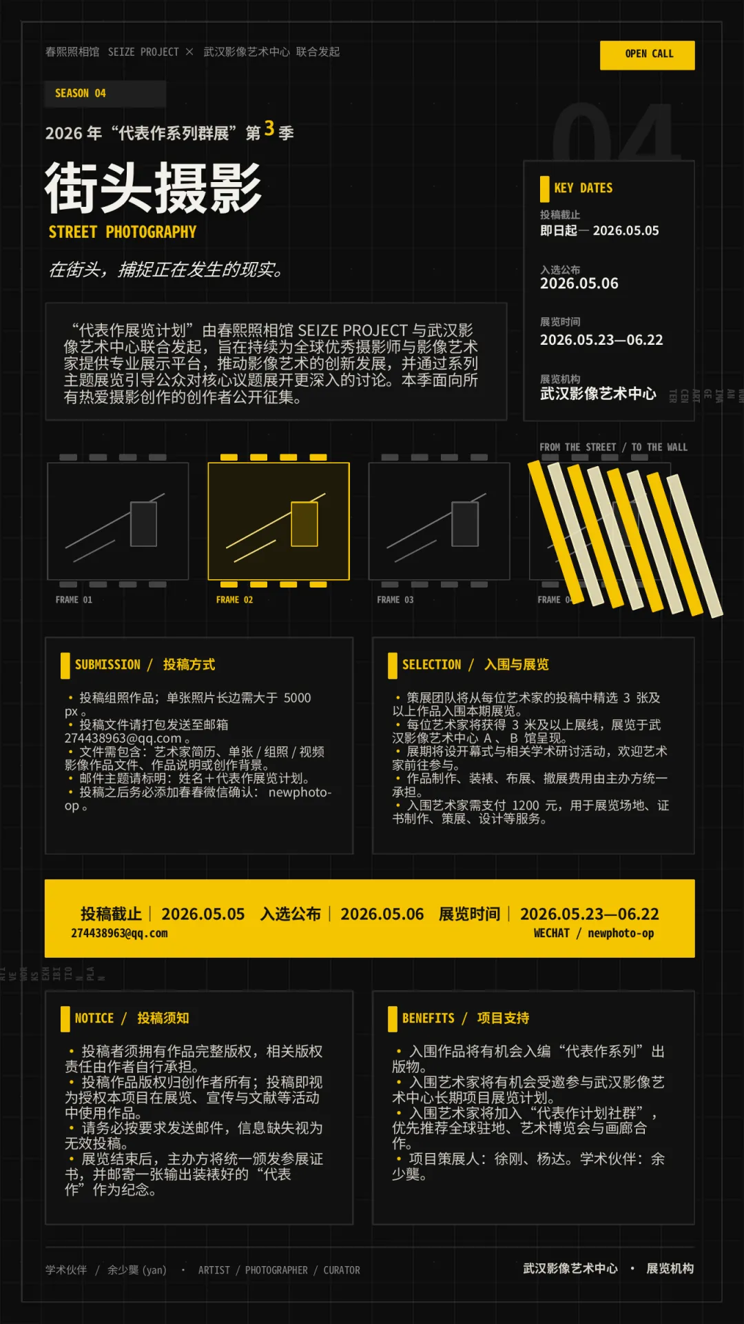 “代表作展览计划”是由春熙照相馆SEIZE PROJECT和武汉影像艺术中心联合发起的一项长期性展览项目。旨在持续为全球优秀摄影师和影像艺术家提供专业展示平台,推动影像艺术的创新发展,并通过系列主题展览引导公众对核心议题进行深入探讨。第3季的代表作系列群展的主题是:街头摄影。现面向热爱摄影创作的所有人开放征集,入选的投稿作品将由学术主持和我们的策展团队共同呈现。展览时间:2026年5月23日—2026年6月22日投稿请以组照形式提交,单张照片长边需大于5000px。投稿文件请打包发送至邮箱:274438963@qq.com投稿文件需包含:艺术家简历、组照/视频影像作品文件、作品说明或创作背景。投稿后请务必添加春春微信确认:newphoto-op入围艺术家需支付1200元(含展览场地、证书制作、策展、设计等服务费用)。展览将于武汉影像艺术中心A、B馆内进行,每位艺术家有3米及以上的展线用于作品呈现,每期展览将设开幕式,和相关的学术研讨活动,欢迎艺术家前往参与。入围艺术家作品制作、装裱、布展、撤展费用统一由主办方承担,艺术家无需支付额外费用。投稿须知