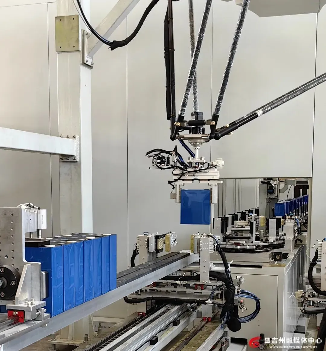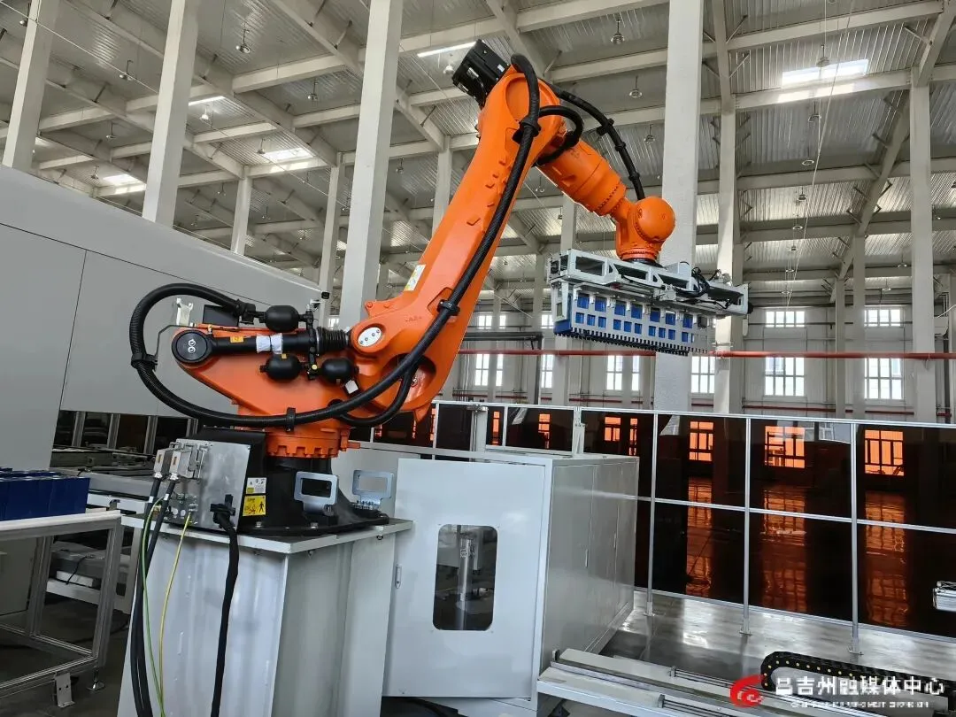 4月8日,吉木萨尔县北庭工业园区新疆高昕智芯能源有限公司生产车间,机械臂正在进行抓取电芯作业。