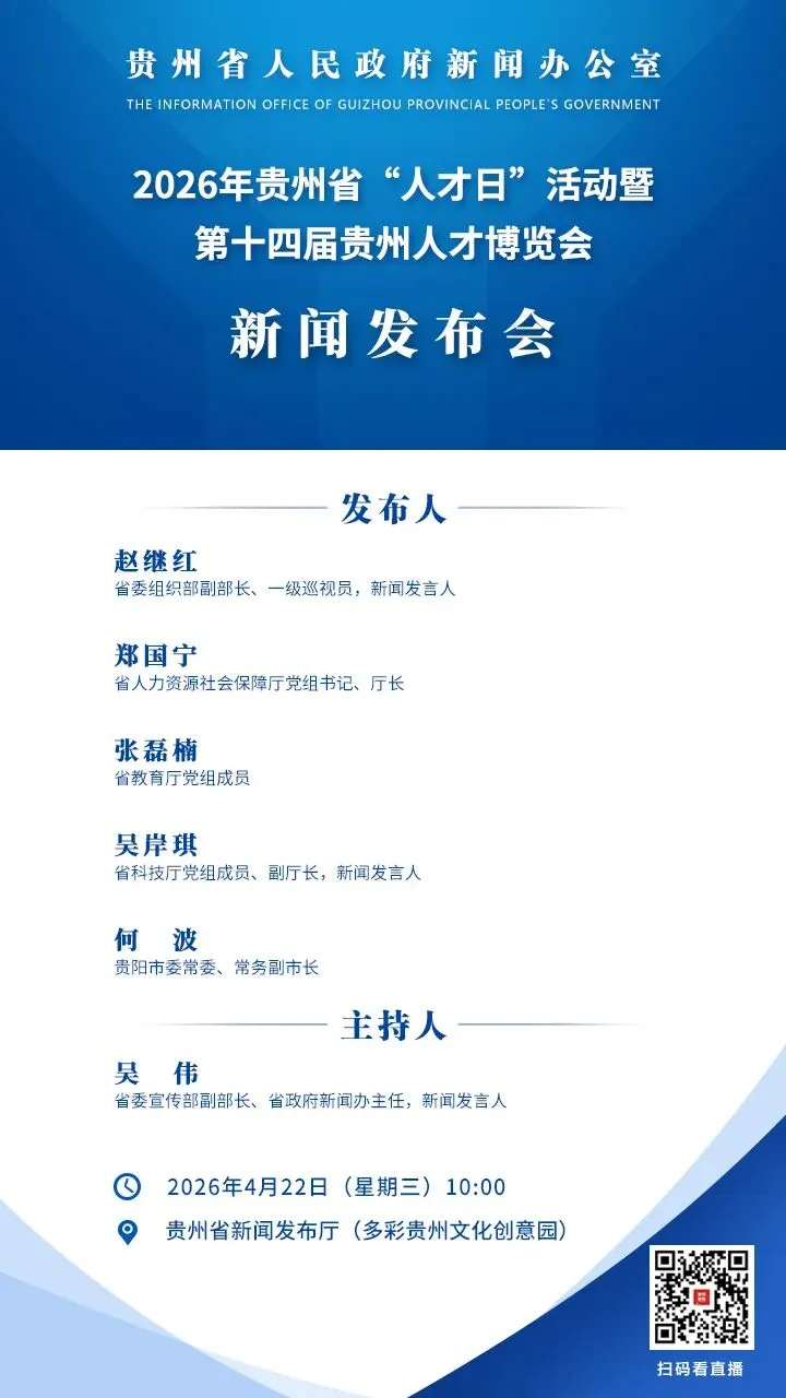 贵州省政府新闻办将于4月22日10:00在贵州省新闻发布厅(多彩贵州文化创意园)举行2026年贵州省“人才日”活动暨第十四届贵州人才博览会新闻发布会。