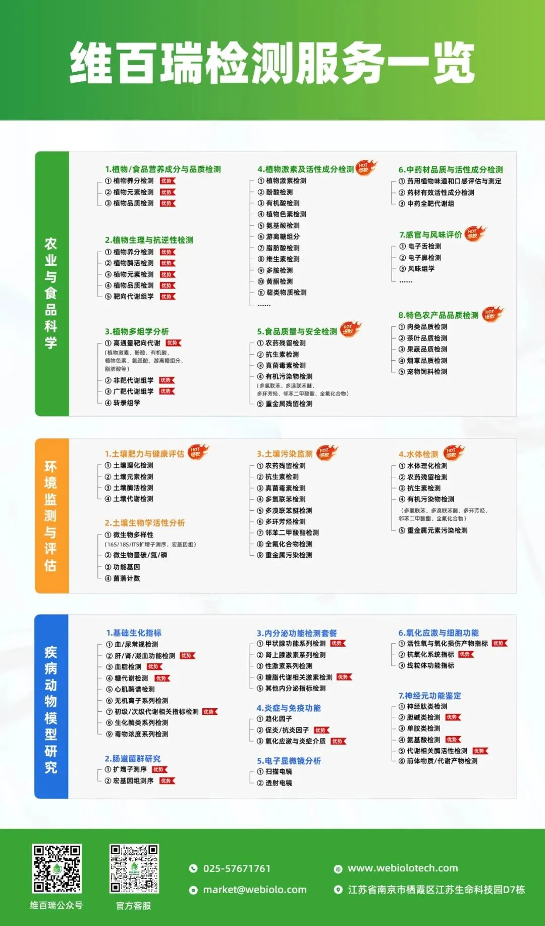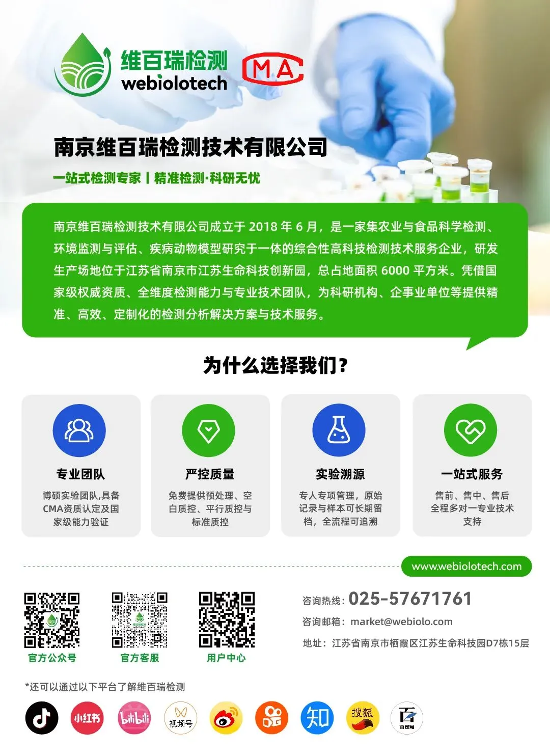 南京维百瑞检测技术有限公司成立于2018年,总部位于江苏生命科技创新园,是一家专注于农业与食品检测、环境监测、疾病动物模型研究的综合性高科技检测服务企业。