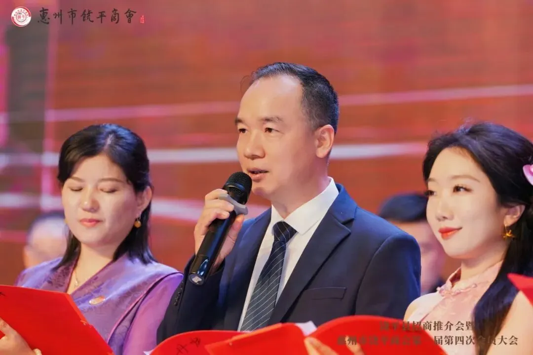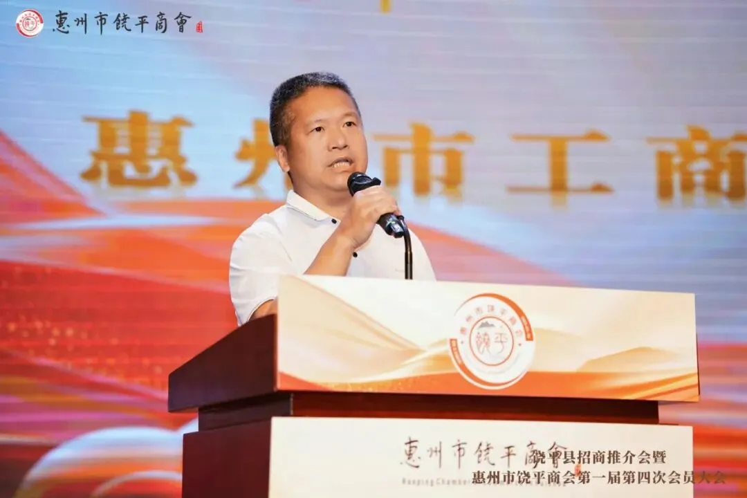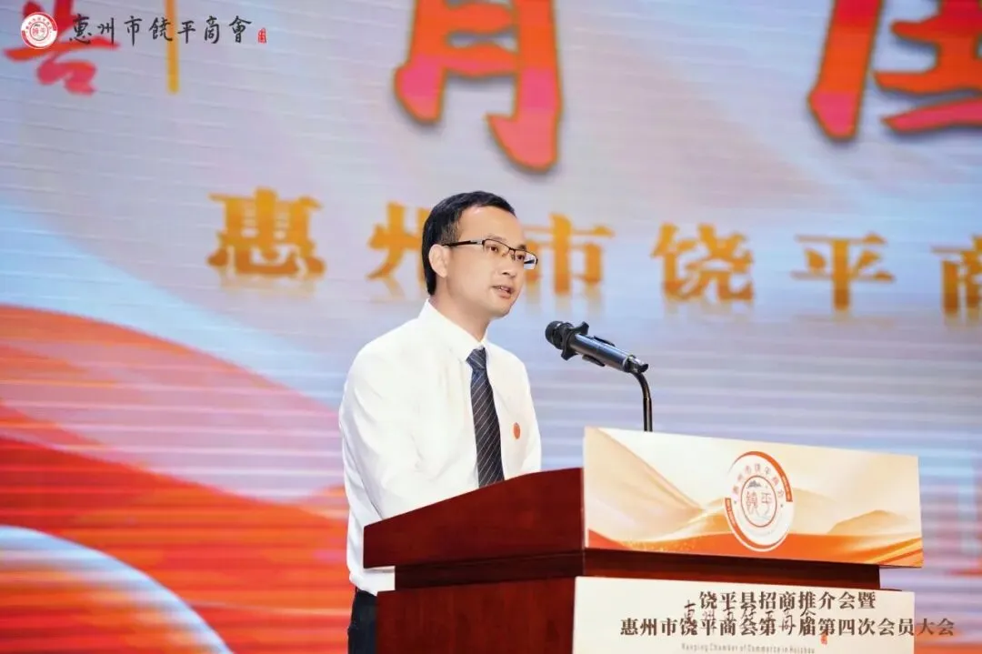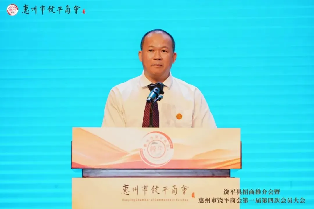市工商联秘书长何华代表市工商联,对惠州市饶平商会大会的召开表示祝贺,充分肯定商会成立三年来在服务会员、回馈社会、促进惠饶交流等方面取得的成绩及饶商精神风貌。围绕协助市委市政府开展招商引资工作,他提出三点希望:一是发挥地缘人文优势,当好 “区域合作” 联络员,推动惠饶两地产业链供应链协同;二是利用侨力资源优势,当好 “对外开放” 桥头堡,以侨为桥吸引外资汇聚;三是坚定发展信心,当好 “以商引商” 排头兵,引导企业扎根惠州、转型升级,形成产业集聚效应。最后,他期望商会继续发挥桥梁纽带作用,为惠州打造广东高质量发展新增长极贡献更大力量,并送上大会与个人发展祝福。